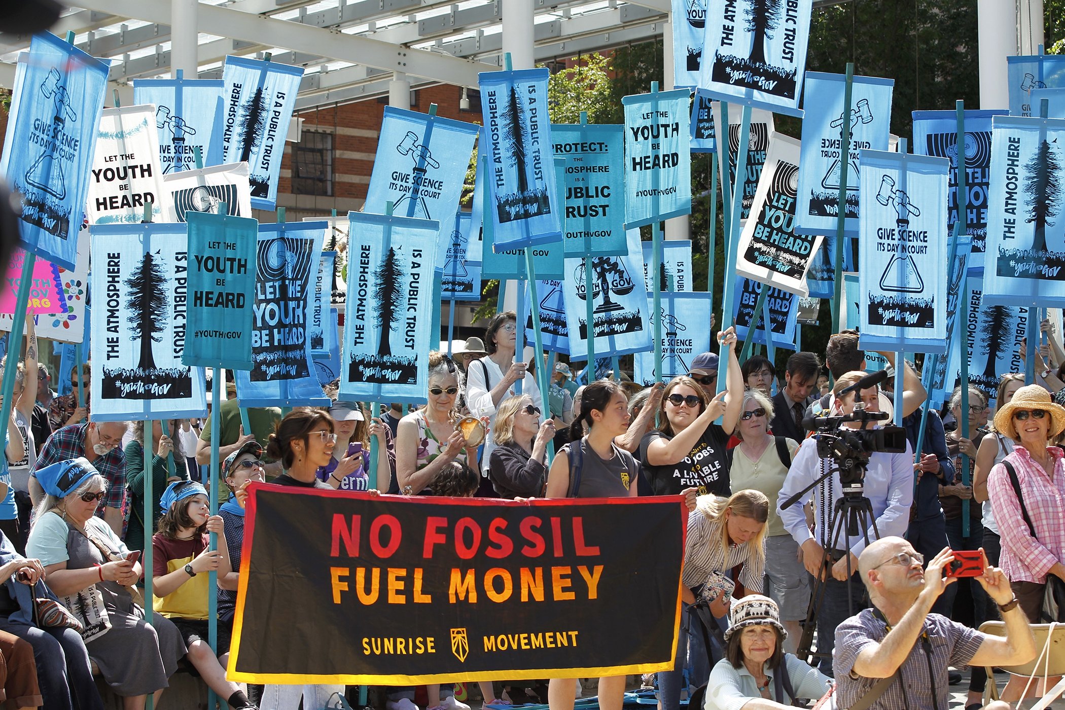Supporters attend a rally for a group of young people who filed a lawsuit saying US energy policies are causing climate change and hurting their future. The group faced a major hurdle Tuesday as lawyers for the Trump administration argued to stop the case from moving forward, in Portland, Ore., June 4, 2019.