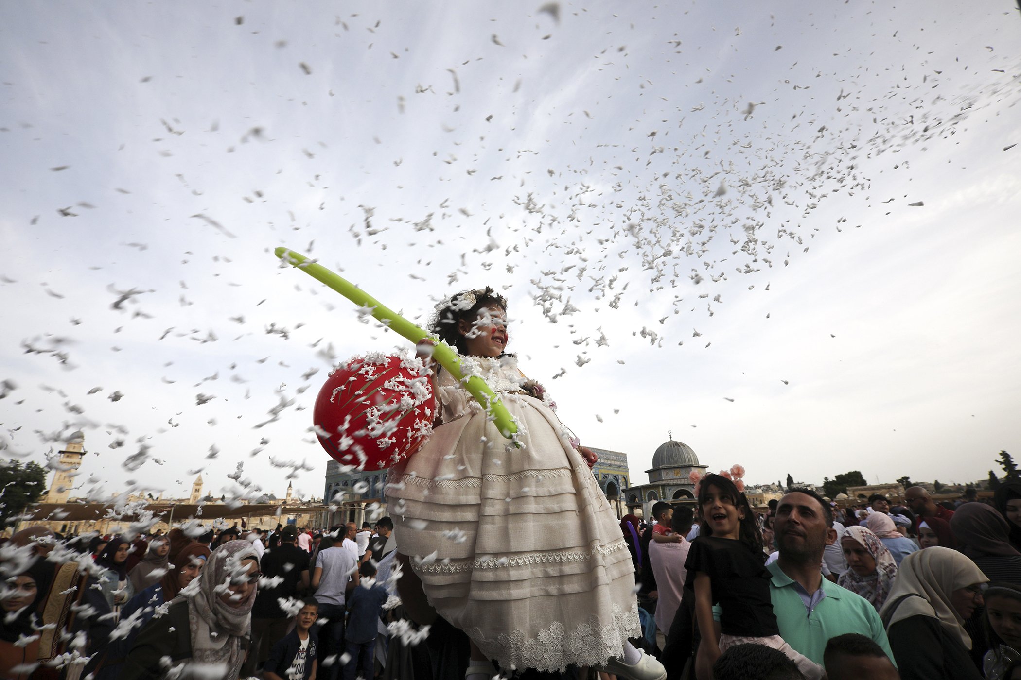Palestinians attend of Eid al-Fitr holiday celebrations by the Dome of the Rock shrine in Jerusalem, Wednesday, June 5, 2019. The holiday marks the end of the holy month of Ramadan, when devout Muslims fast from sunrise to sunset.