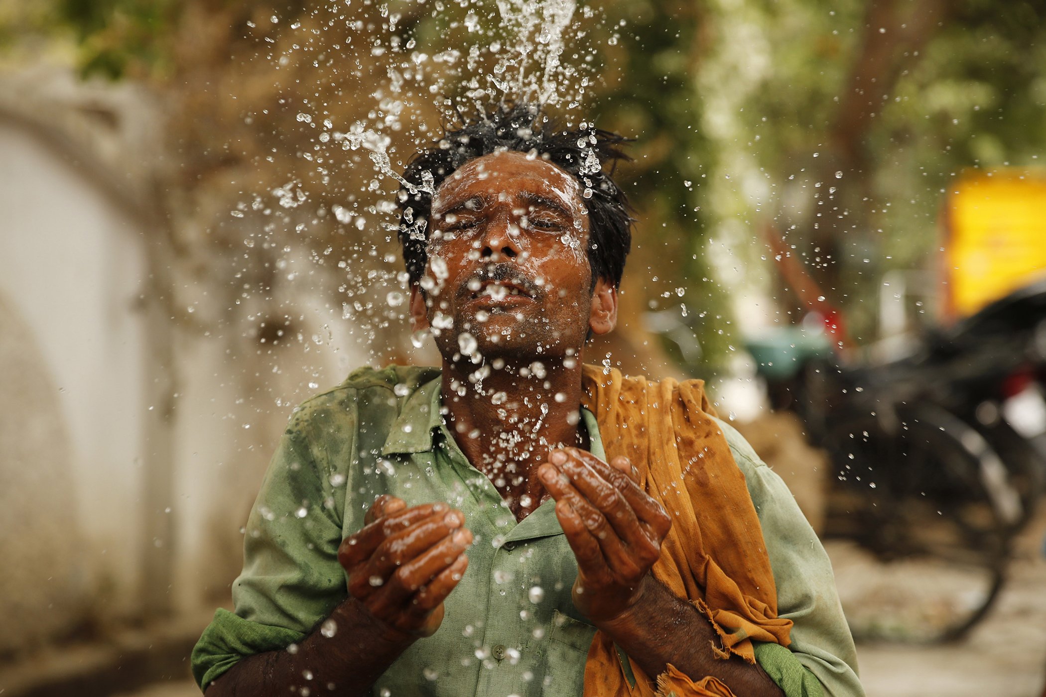 An Indian worker splashes water on his face to cool himself on a hot summer afternoon in Prayagraj, Uttar Pradesh, India, June 13, 2019. Severe heat wave conditions are sweeping north and western parts of India with maximum temperature soaring to 48 degree Celsius (118 F) in some areas.