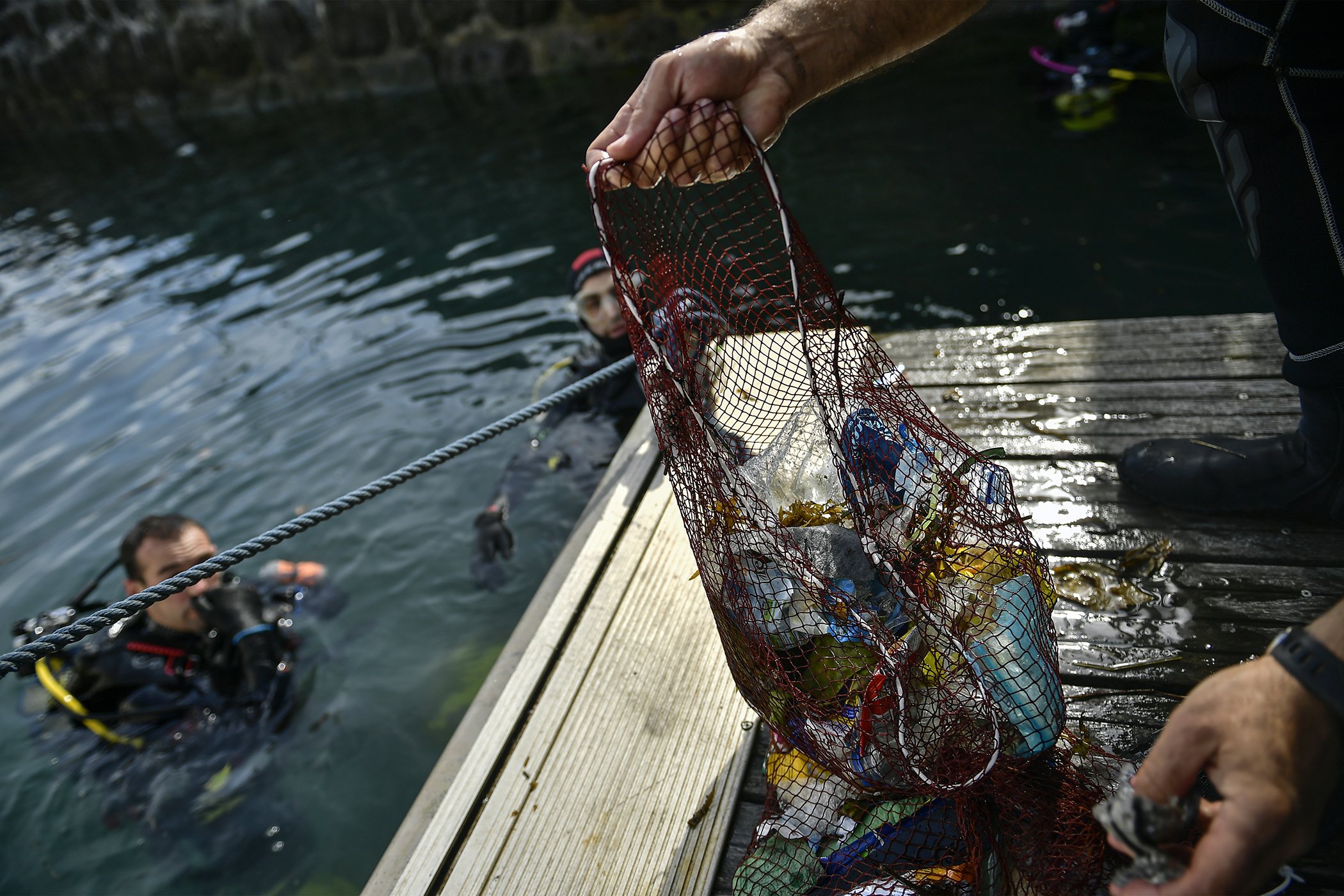 A diver holds some waste he removed from the sea in the Basque village of Bermeo, northern Spain, June 8, 2019. People are celebrating International Sea Day on Saturday, in support and defense of the environment marine.