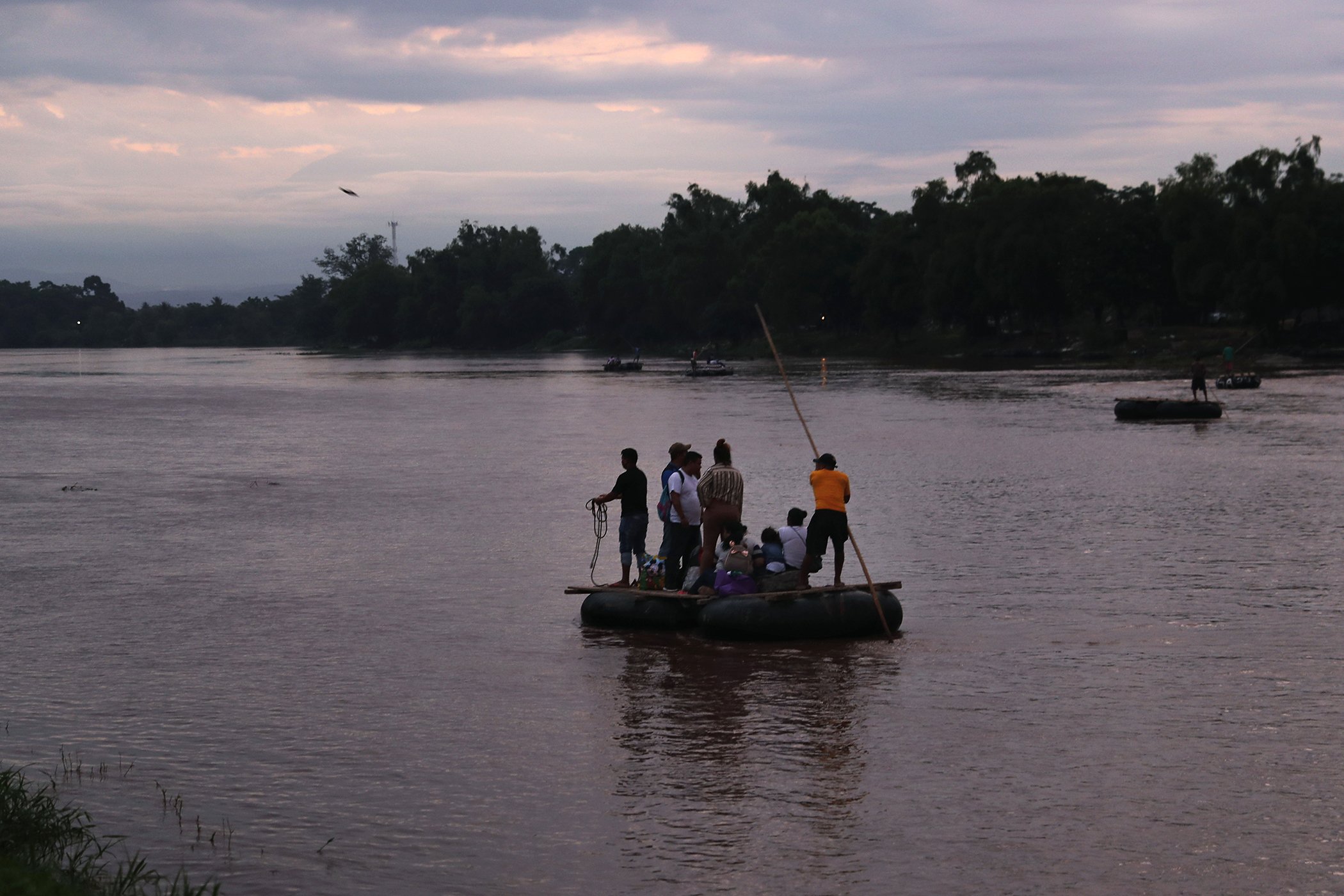 Migrants travel from Guatemala to Mexico on a raft, pushed with a pole by its operator who charges his passengers, across the Suchiate River near Ciudad Hidalgo, Mexico, early on June 9, 2019. Mexican and US officials reached an accord late Friday that calls on Mexico to crackdown on migrants in exchange for Trump backing off his threat to impose a 5% tariff on Mexico’s exports if it did not stem the flow of Central American migrants crossing its territory toward the US.