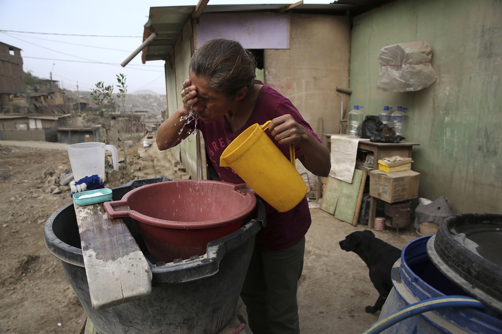 Maria Jimenez washes her face with water outside her home in the Nueva Esperanza shantytown of Lima, Peru, Thursday, March 21, 2019. Residents here pay about $1.50 dollars per 50 liter container which is filled by a water truck services that passes daily. World Water Day will be marked on Friday, March 22, 2019.