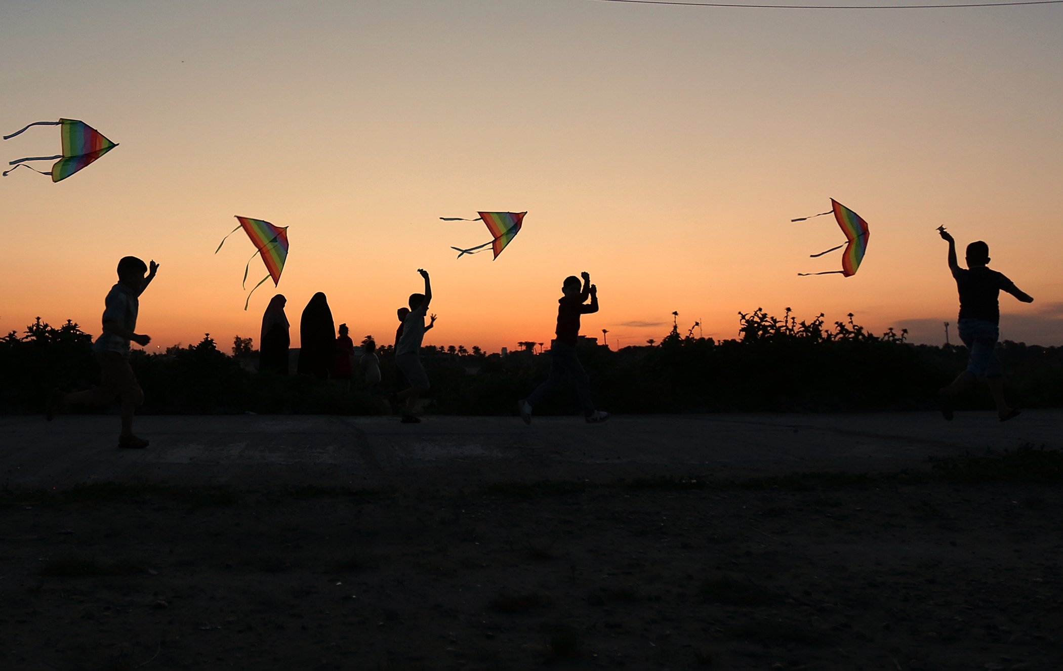 Children launch kites during Nowruz celebration as the sun sets in Baghdad, Iraq, Thursday, March 21, 2019. Nowruz, the Farsi-language word for "new year", is an ancient Persian festival, celebrated on the first day of spring in countries including Iraq, Turkey, Afghanistan and Iran. The festival is a symbolic opportunity to purify the soul for the new year and symbolizes revival and is marked by spring cleaning, buying new clothes and planting trees. March 21, the first day of spring, marks Nowruz.