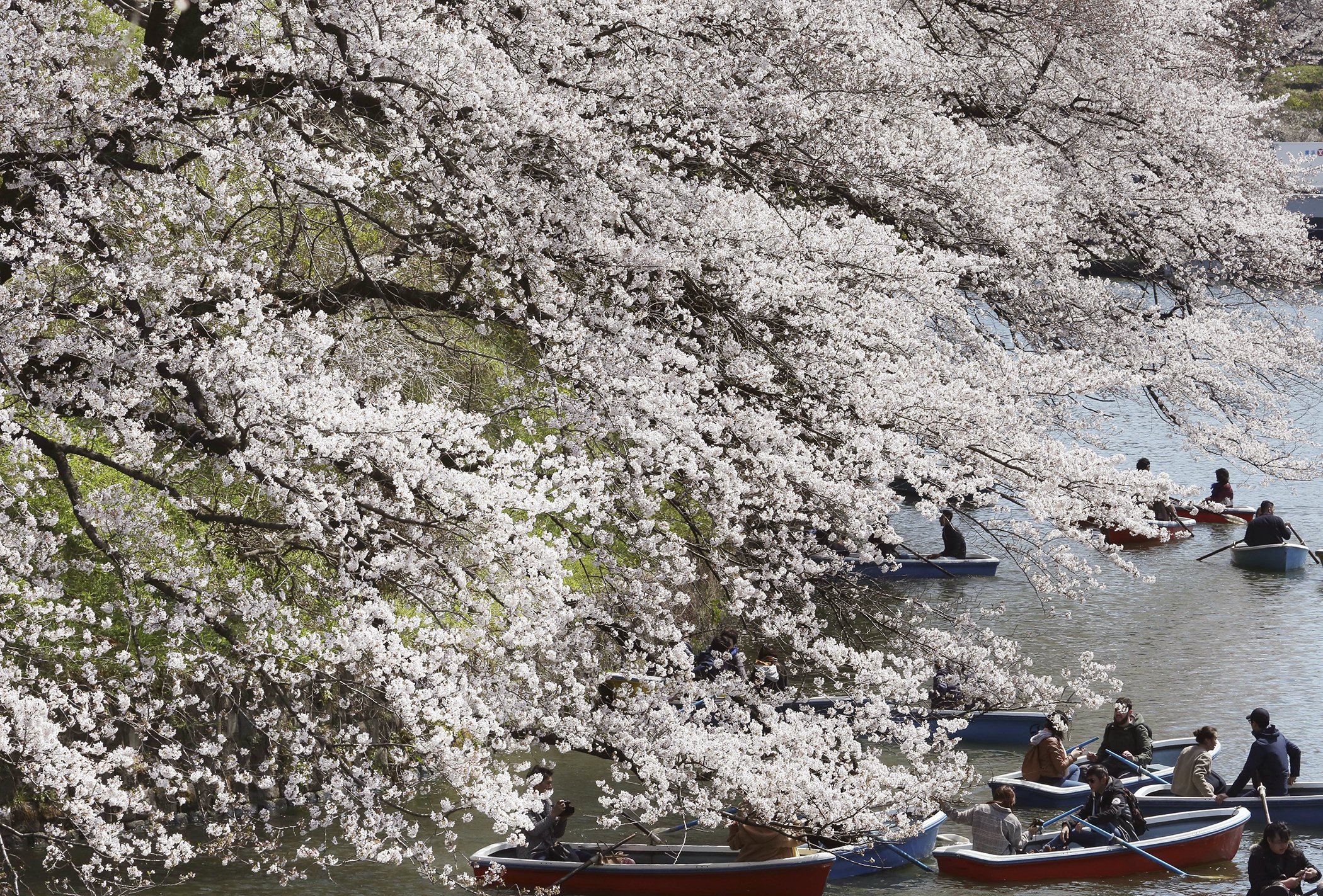 People on boat enjoy blooming cherry blossoms along the Chidorigafuchi Imperial Palace moat in Tokyo, Wednesday, April 3, 2019.