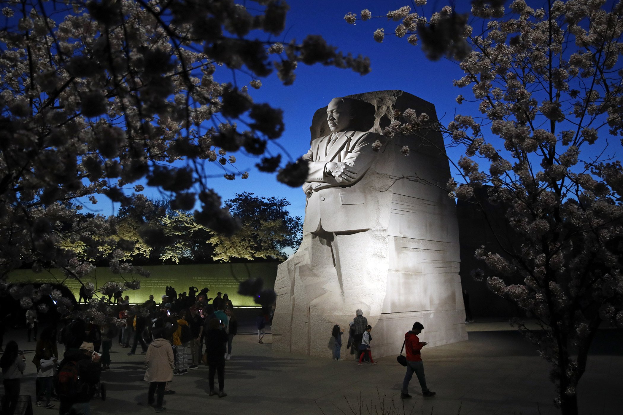 Cherry blossom trees surround the Martin Luther King, Jr., Memorial at dusk, Wednesday, April 3, 2019, in Washington, DC.