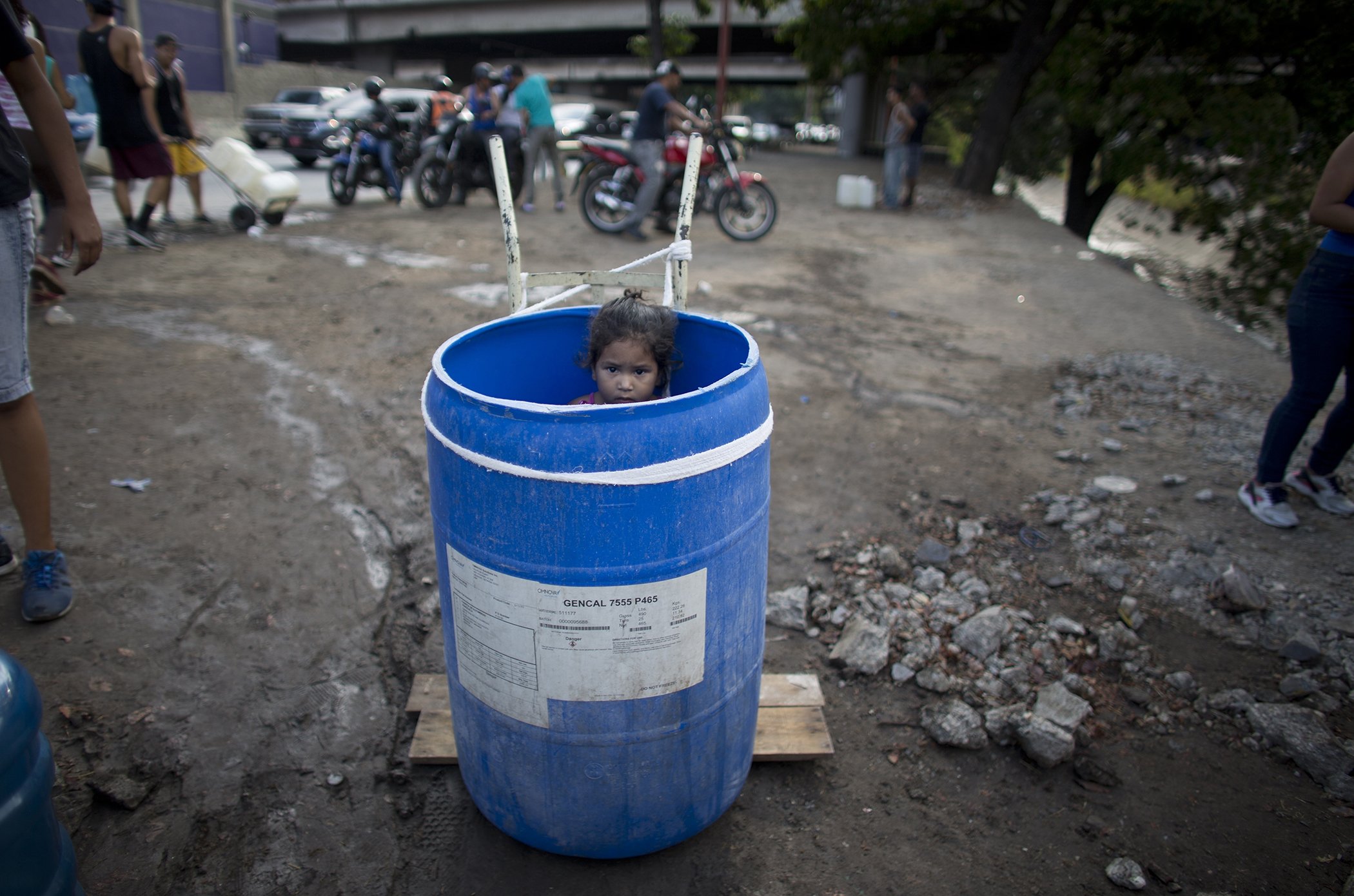 A little girl stands inside a plastic barrel while her family waits to collect water from an open pipe above the Guaire River, during rolling blackouts which affect the water pumps in people's homes, offices and stores, in Caracas, Venezuela, Monday, March 11, 2019. The blackout has intensified the toxic political climate, with opposition leader Juan Guaido blaming alleged government corruption and mismanagement and President Nicolas Maduro accusing his U.S.-backed adversary of sabotaging the national grid.