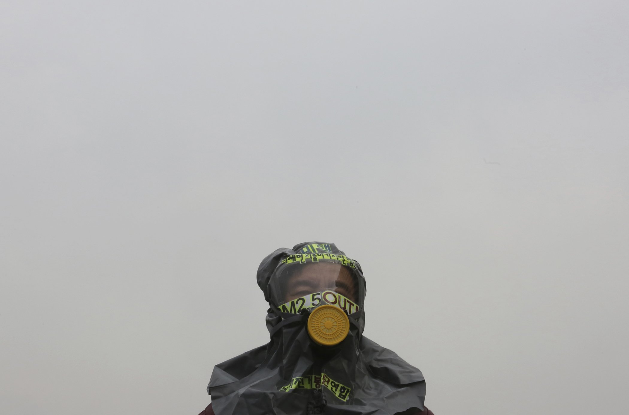 A South Korean environmental activist wearing a gas mask stands in protest demanding the government to ease air pollution in Seoul, South Korea, Friday, March 15, 2019. South Korean President Moon Jae-in on March 6, proposed a joint project with China to use artificial rain to clean the air in Seoul, where an acute increase in pollution has caused alarm. The signs read: "The fine dust particles."