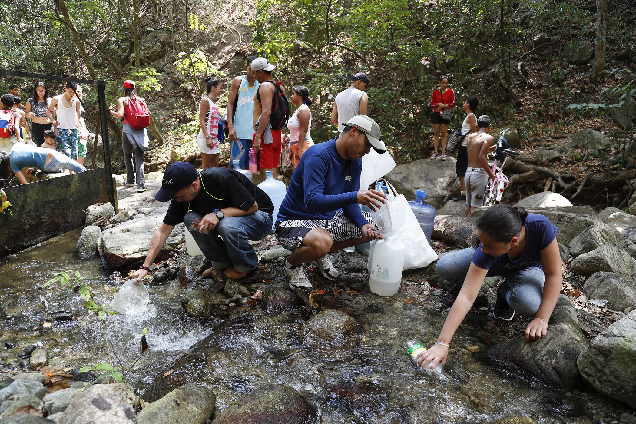 People collect water from a stream in Avila National Park during rolling blackouts, which affects the water pumps in people's homes and apartment buildings, in Caracas, Venezuela, Sunday, March 10, 2019. Venezuelans reached new levels of desperation Sunday as the country’s worst blackouts took their toll, gathering in larger numbers than usual at springs in the mountains of Caracas to collect water and scrounging for scarce cash to pay for food in the few shops that were open.