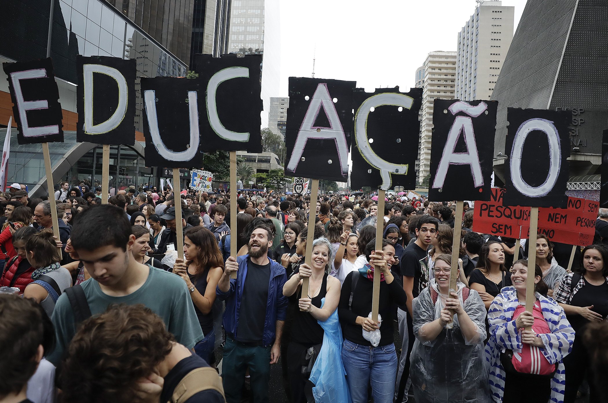 Demonstrators protest against a massive cut in the education budget imposed by the administration of Brazilian President Jair Bolsonaro, in Sao Paulo, Brazil, Wednesday, May 15, 2019. Federal education officials this month announced budget cuts of $1.85 billion for public education, part of a wider government effort to slash spending.