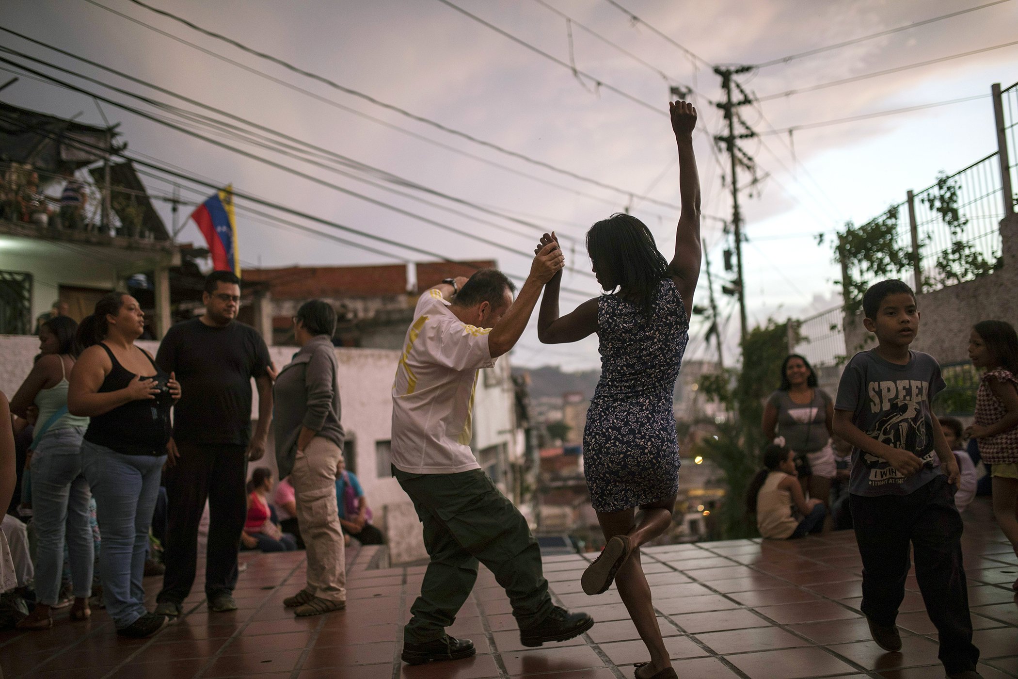 Irene Vaamondez, right, dances with a neighbor as musicians play live music at a public plaza where neighbors socialize in Caracas, Venezuela, at sunset on May 11, 2019.