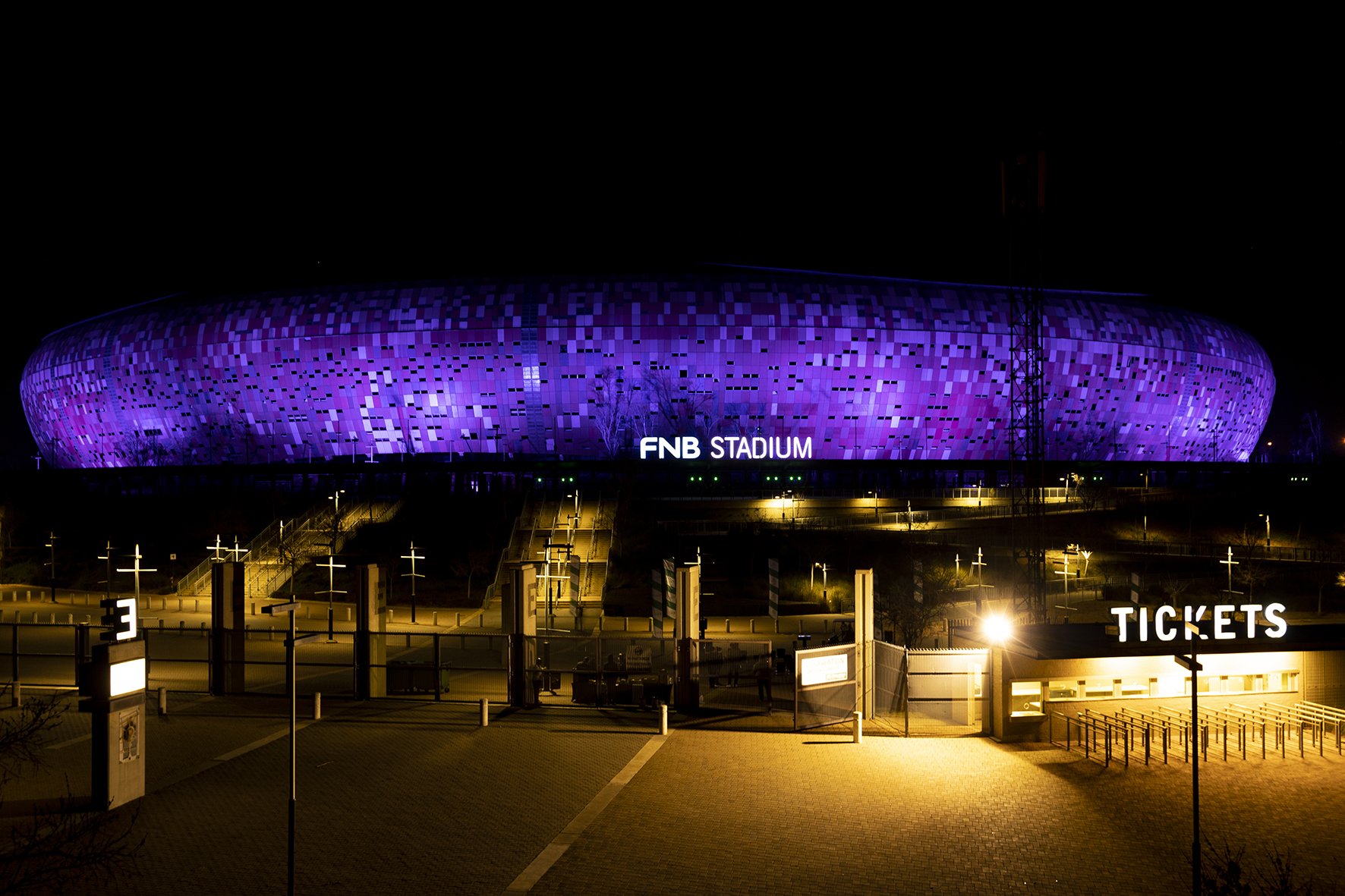 FNB Stadium is photographed lit up in Johannesburg, South Africa.