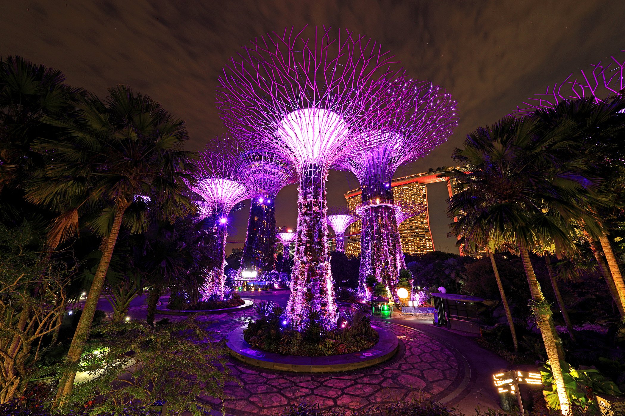 The Supertree Grove at the Gardens by the Bay is lit up on Aug. 19, 2021 in Singapore.