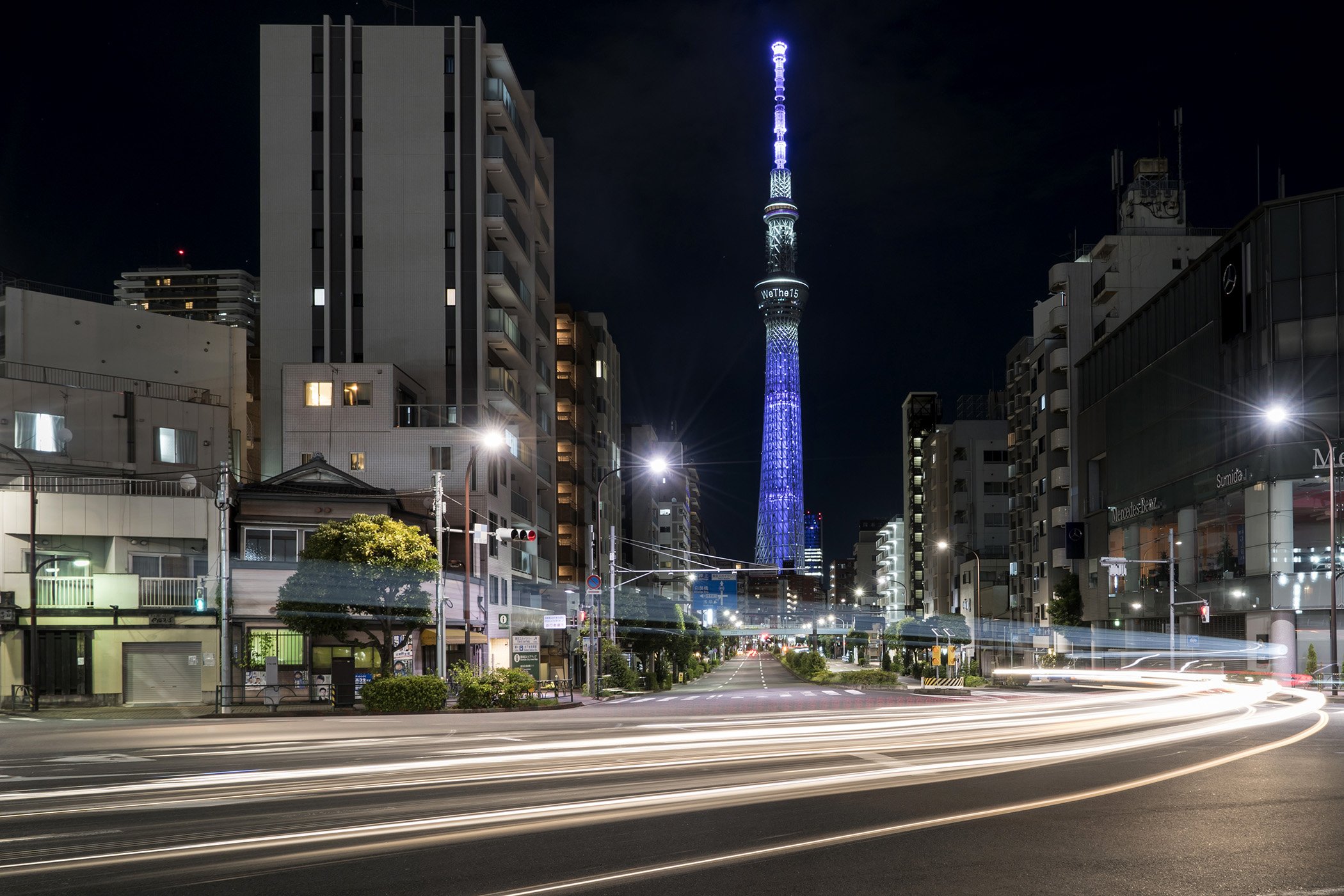 The Tokyo Skytree is illuminated in purple colored light on August 19, 2021 in Tokyo, Japan.