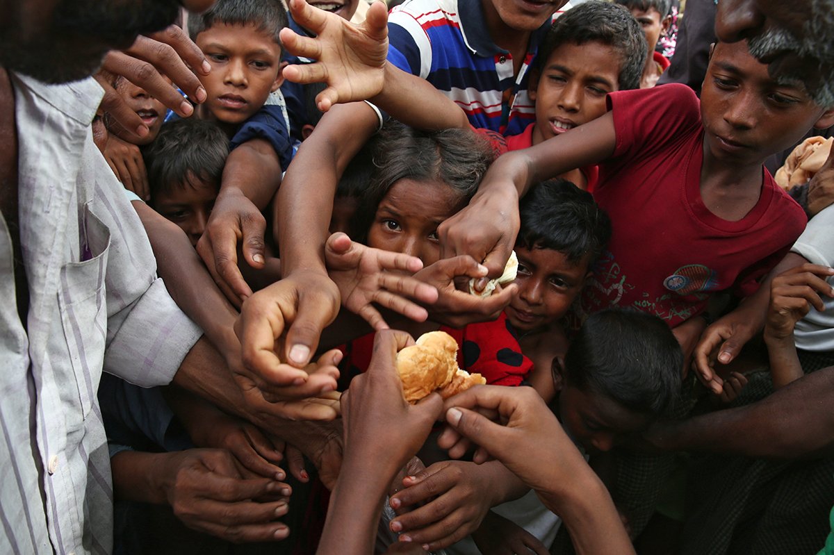 Myanmar's Rohingya Muslim ethnic minority children stretch their hands out to receive food distributed by locals at the Kutupalong makeshift refugee camp in Cox's Bazar, Bangladesh, Wednesday, Aug. 30, 2017. Thousands of Rohingya Muslims have fled fresh violence in Myanmar and crossed into Bangladesh in less than a week, with hundreds stranded in no man's land at the countries' border, the International Organization for Migration said Wednesday.