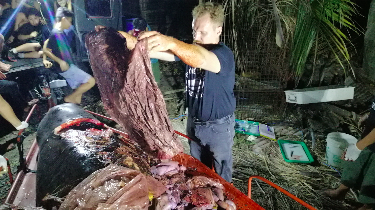 Pictures from the whale’s necropsy show Blachley pulling out reams of plastic mixed with guts.