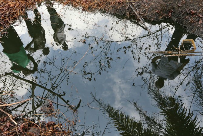 “If we know how much the government gets from the companies, we can pressure them to allocate some of what they have gotten into remediation of the environment,” Okoro says, standing next to a small spring, black with oil, reflecting the troubled faces of the farmers peering into it.