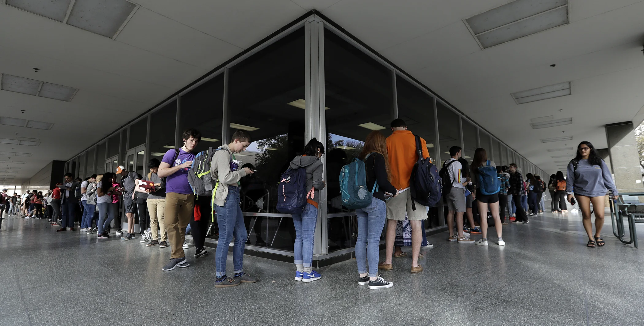 A line of mostly students wait to vote at a Texas primary election polling site on the University of Texas campus in Austin, Texas on March 6, 2018.