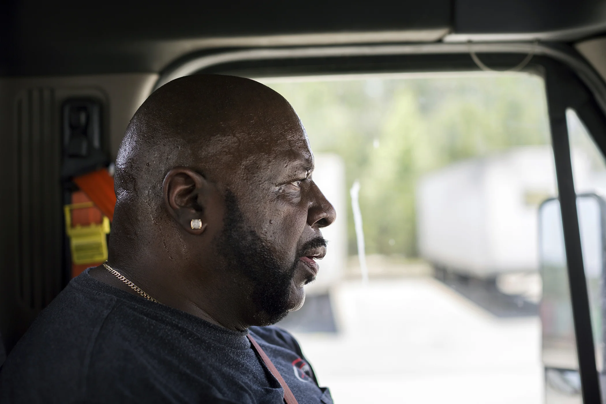 Leon Brown drives his tractor-trailer on a delivery to the Port of Savannah, in Garden City, Ga in May 2019. After being released from prison, Brown is cut off from voting due to a vaguely worded law that state election officials interpret very strictly.