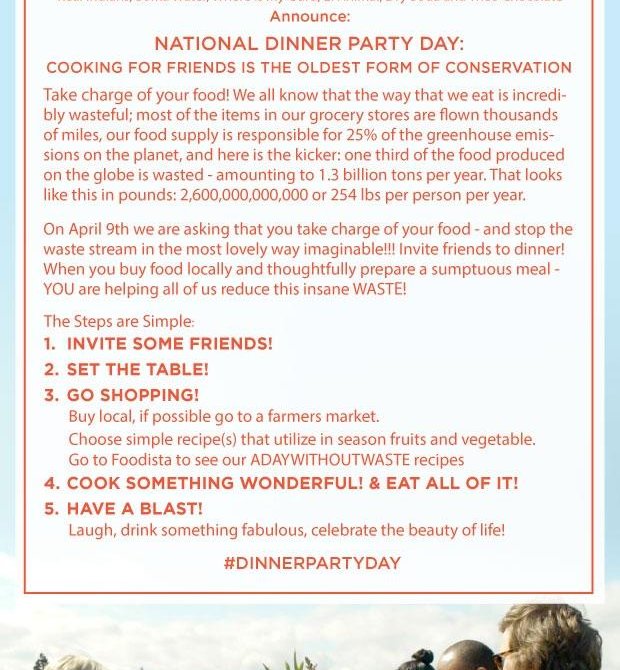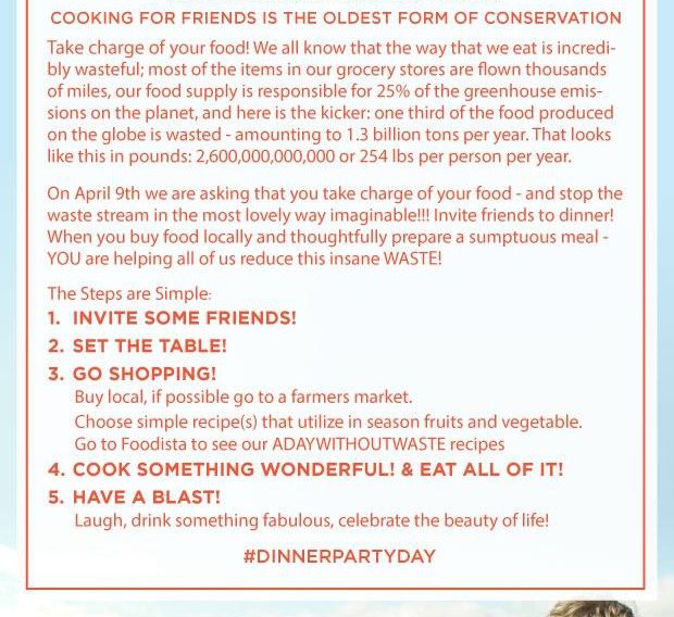 On April 9th we are asking that you make a different choice by halting the waste stream in the most lovely way imaginable. Invite friends to dinner! When you buy food locally, and thoughtfully prepare an awe-inspiring meal, YOU are the change that reduces this thoughtless, insane WASTE! And most likely, while doing it, you will have a wonderful time! If you do throw down, and toss a spring vegetable stew in the oven and invite your favorite humans, send us a pic and tell us what you are cooking. #ADayWithoutWaste.