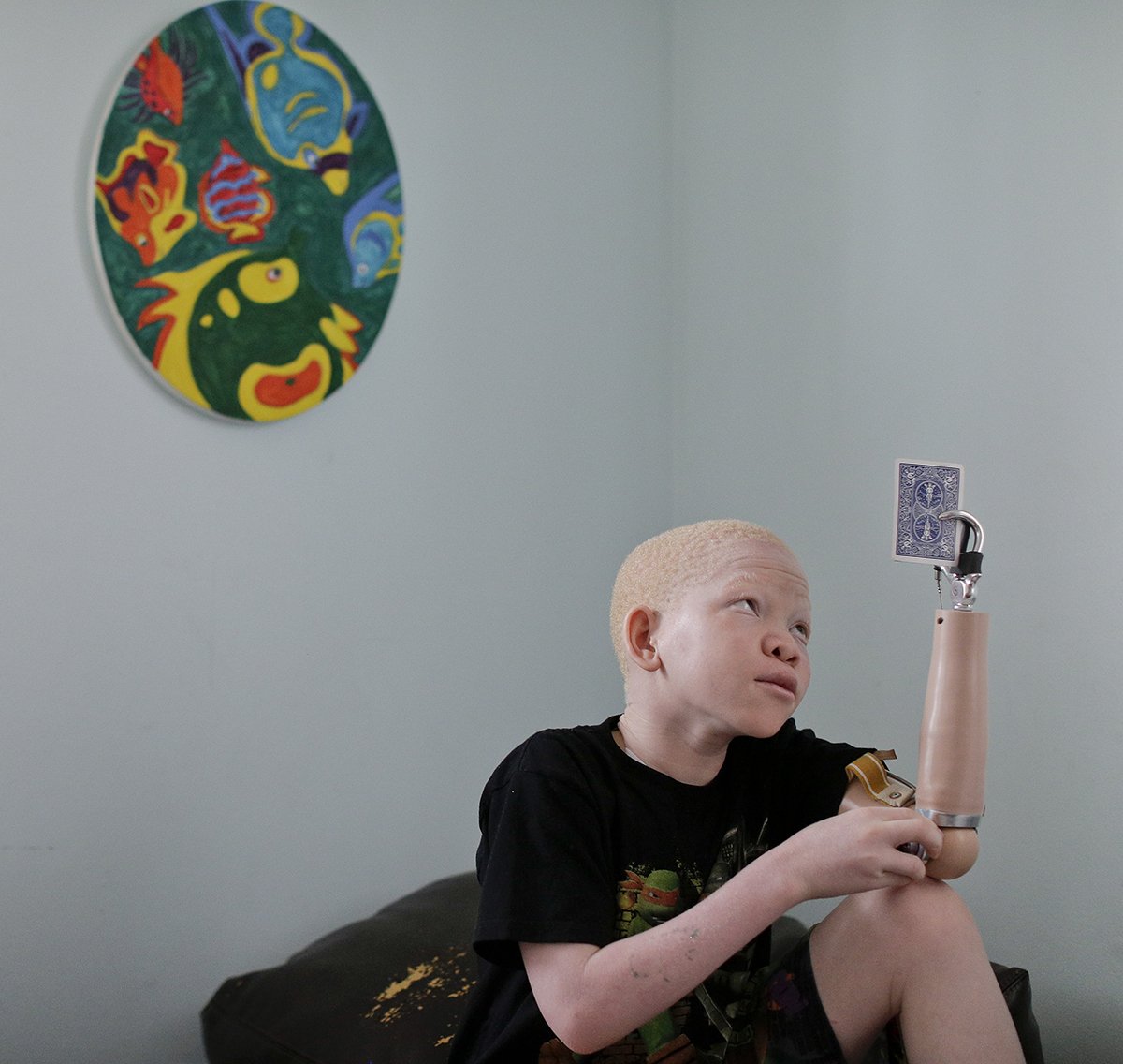 Mwigulu Matonange Magesa, 12, adjusts his prosthetic as he plays a card game at the GMRF group home, Saturday, Aug. 29, 2015, in Staten Island, N.Y. Mwigulu and four other children from Tanzania have been in the United States for more than two months to receive surgery and prostheses for limbs that were cut off to be used for witchcraft.