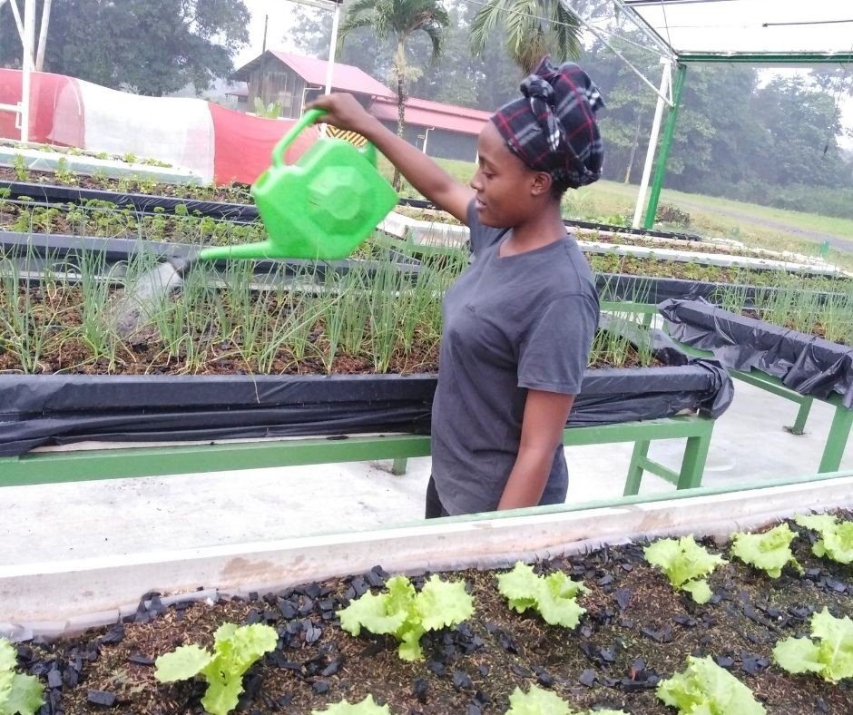 Dorcas, a CAMFED Association member and climate-smart agripreneur expert, watering onions and lettuce grown on elevated soilless beds at EARTH University, Costa Rica.