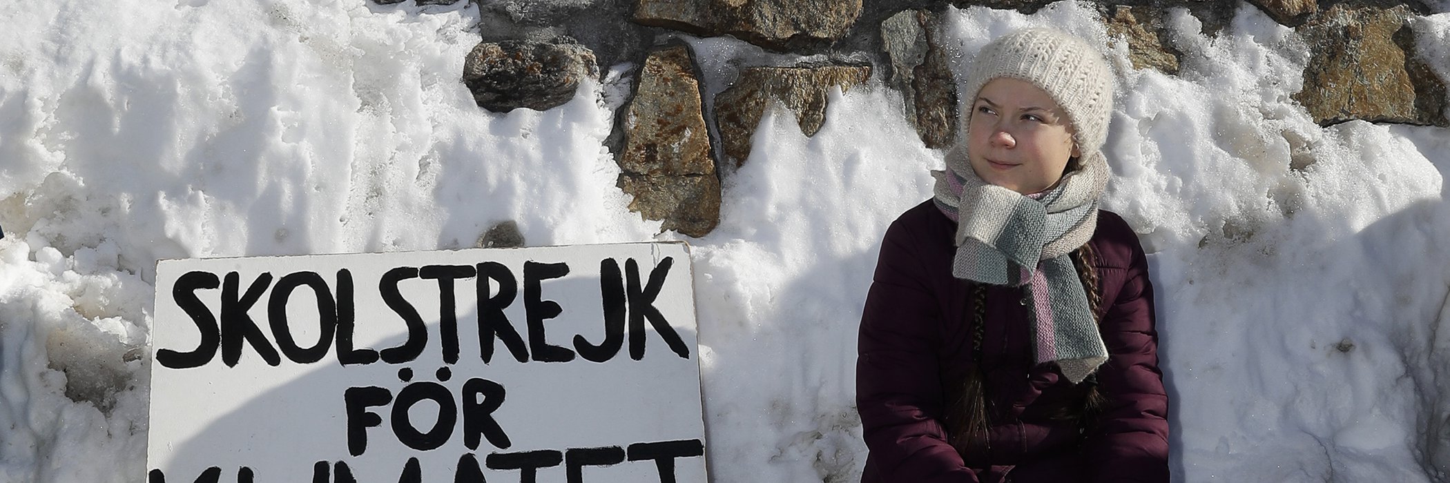 Climate activist Greta Thunberg poses for media outside the congress center where the World Economic Forum take place in Davos, Switzerland, Friday, Jan. 25, 2019. The poster reads: 'School strike for the climate'.