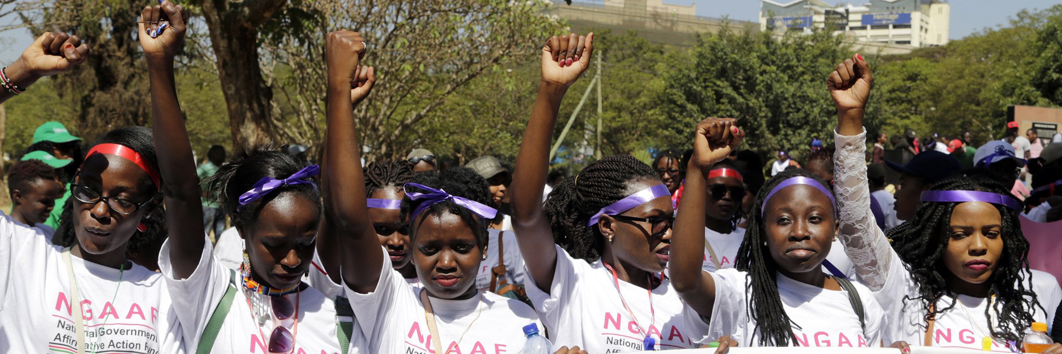 Kenyan women shout slogans during a march to mark International Women's Day in Nairobi, Kenya, March 8, 2019. Hundreds of women marched in downtown Nairobi highlighting domestic violence, sexual attacks and discrimination in jobs and wages.