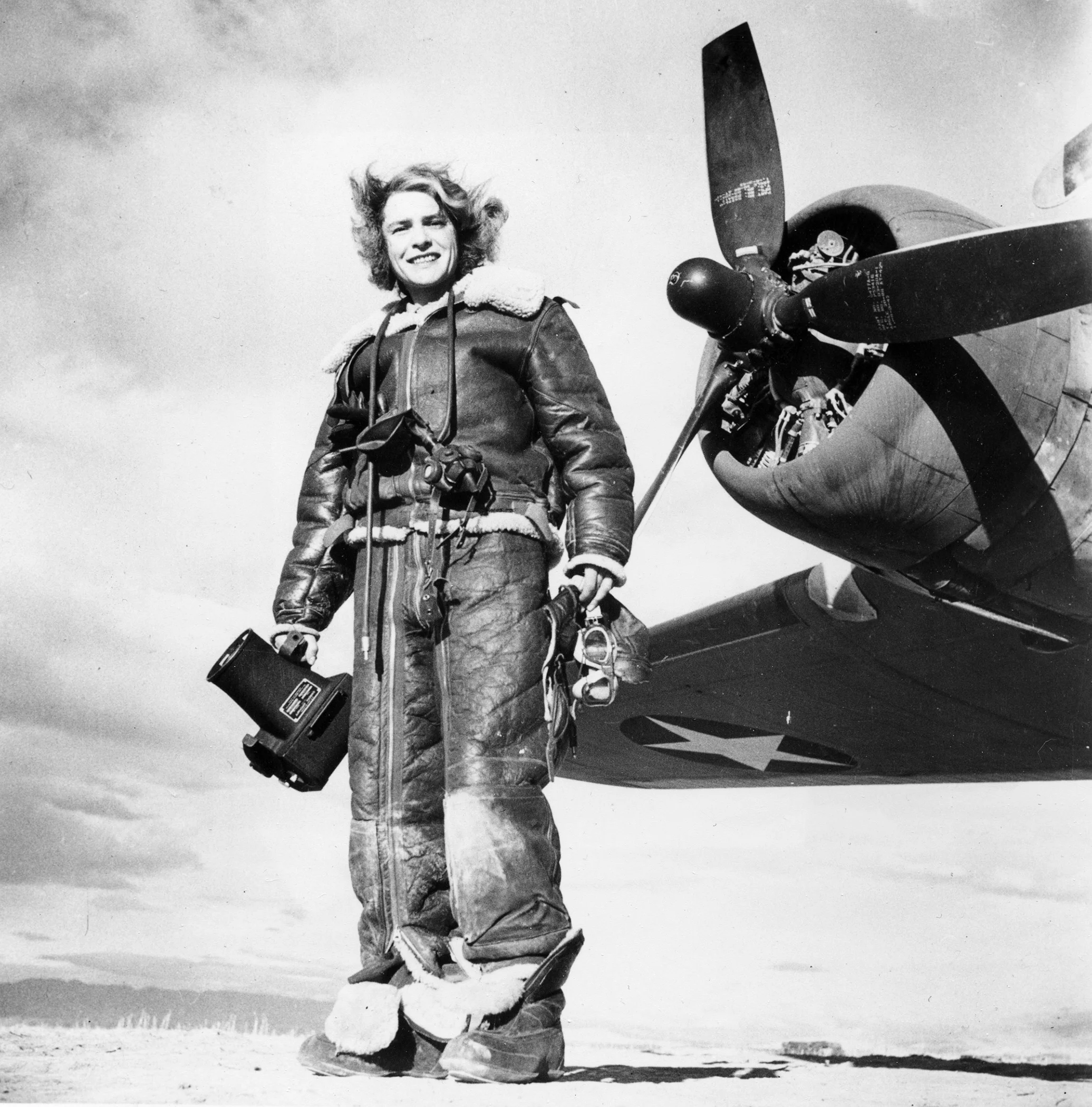 Life magazine photojournalist Margaret Bourke-White wears high-altitude flying gear in front of an Allied Flying Fortress airplane during a World War II assignment in February 1943.