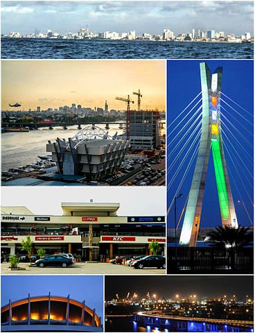 Clockwise from top: Victoria Island skyline from the Gulf of Guinea, Lekki-Ikoyi Link Bridge, Apapa Port, National Arts Theatre, Iganmu, The Ikeja City Mall, and The Lagos Island CBD.