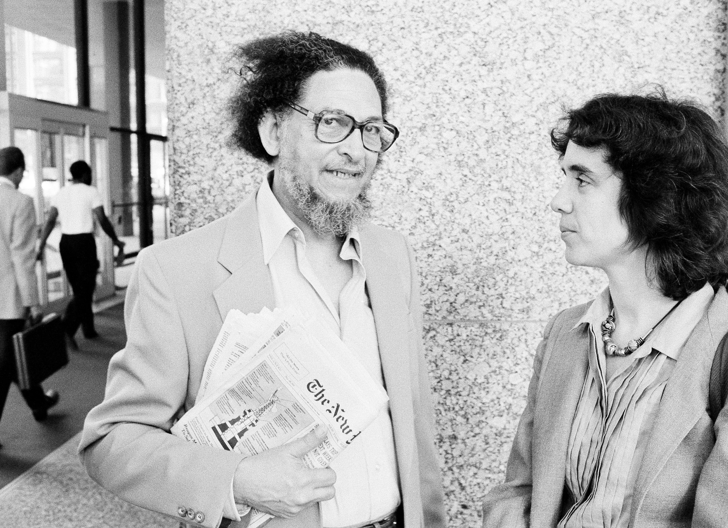 Northwestern University English Professor Dennis Brutus speaks with his attorney, Susan Gzesch, as they arrive at the Federal Building in Chicago, July 20, 1983. Brutus testified in the U.S. Immigration Court on Wednesday, that he feared he would be assassinated by South African agents if forced to return to his native Zimbabwe. He faces the possible deportation for failing to renew his visa in 1980.
