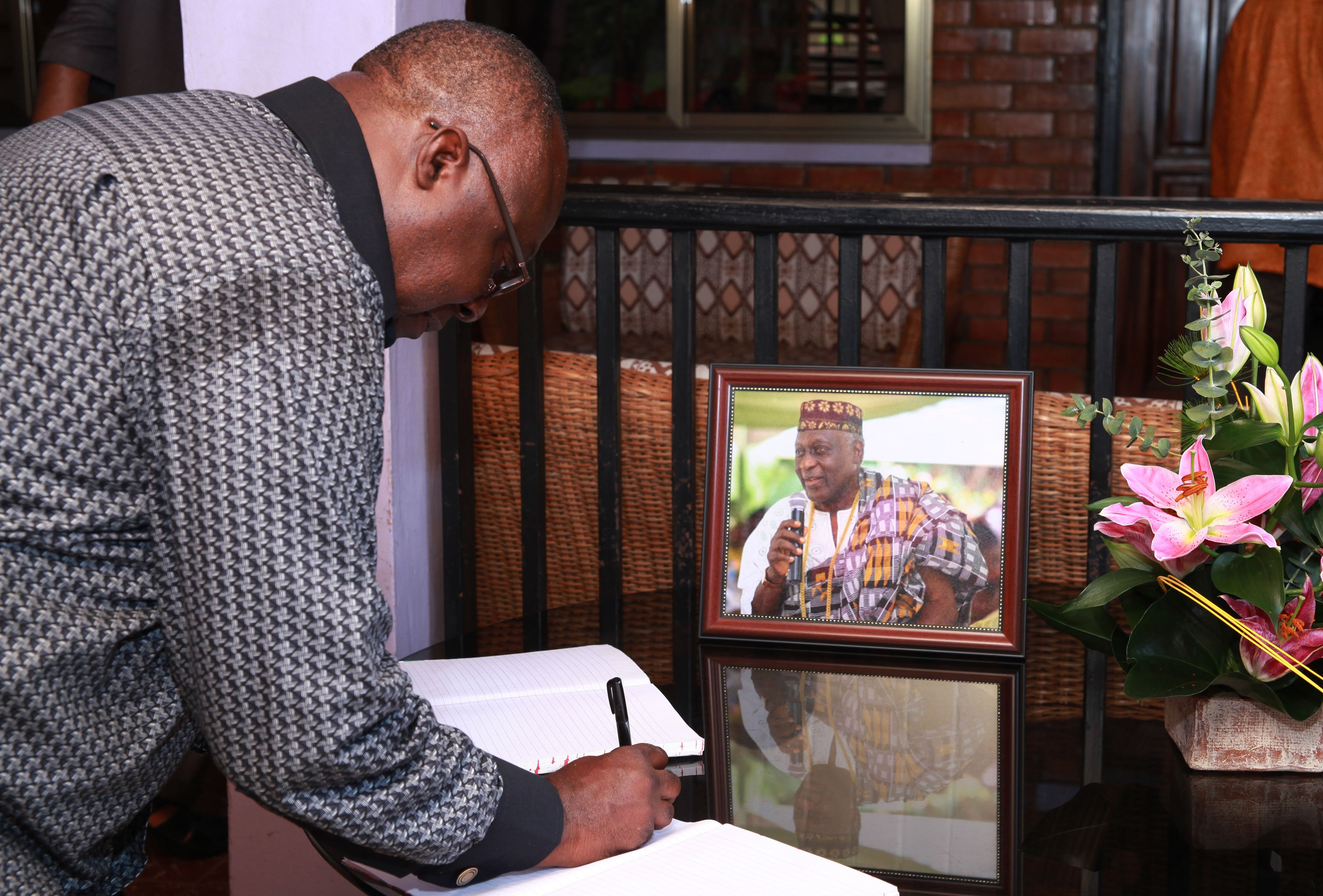 A well-wisher signs the condolences book for Ghanaian poet, professor, and former ambassador Kofi Awoonor, seen in the framed photograph, at Awoonor's residence in Accra, Ghana, Monday, Sept. 23, 2013. The celebrated poet died after being wounded in the attack by al-Shabab militants on Westgate mall in Nairobi, Kenya, Ghana's presidential office confirmed. The al-Qaida linked group launched their assault on Saturday, Sept. 21, storming the mall with grenades and gunfire. Awoonor's son was injured and is responding to treatment.
