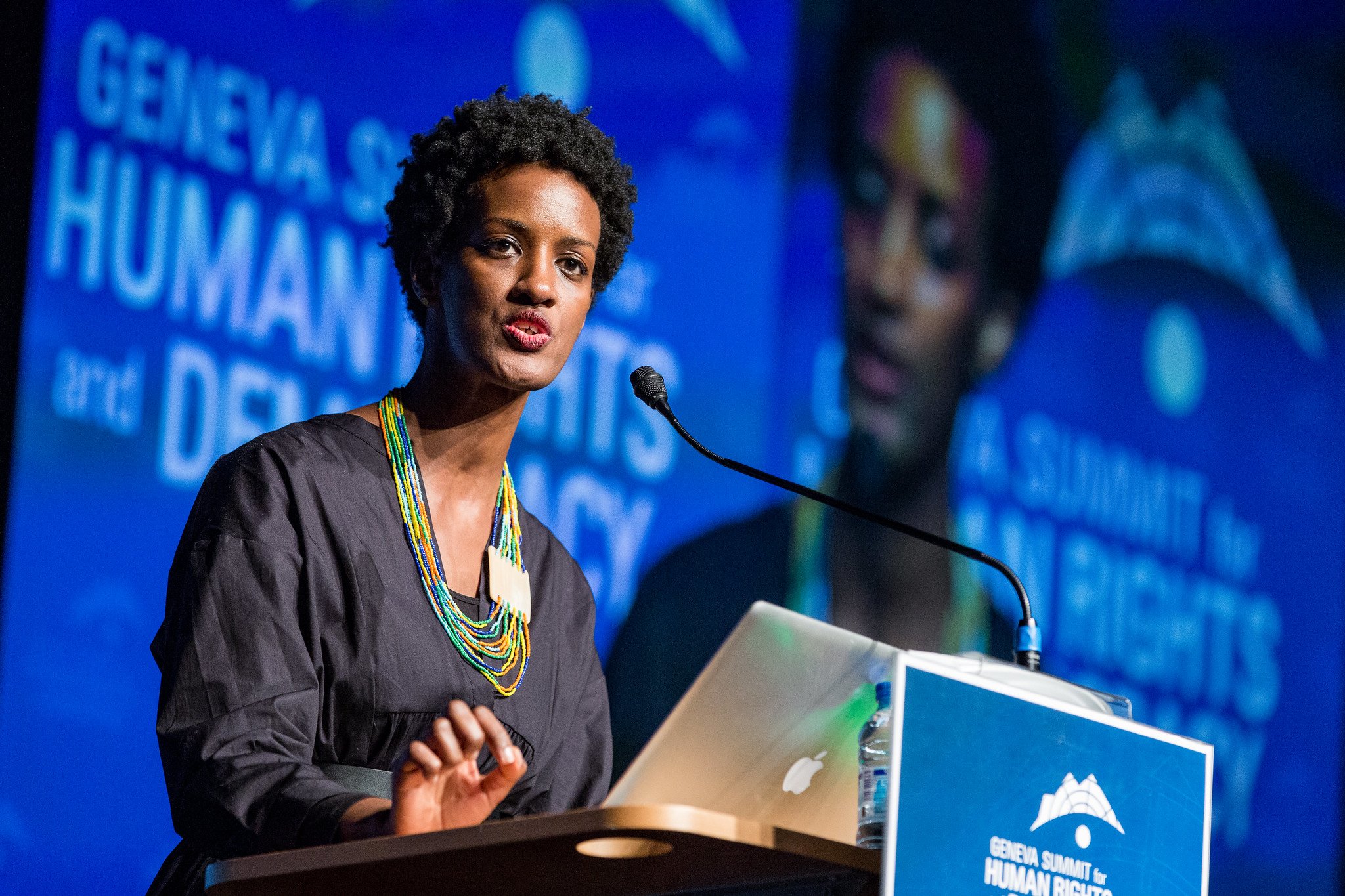 Ketty Nivyabandi, a poet and exiled Burundian democracy activist who led a movement of women-only protests, speaks at the 11th Annual Geneva Summit for Human Rights and Democracy in March 2019.