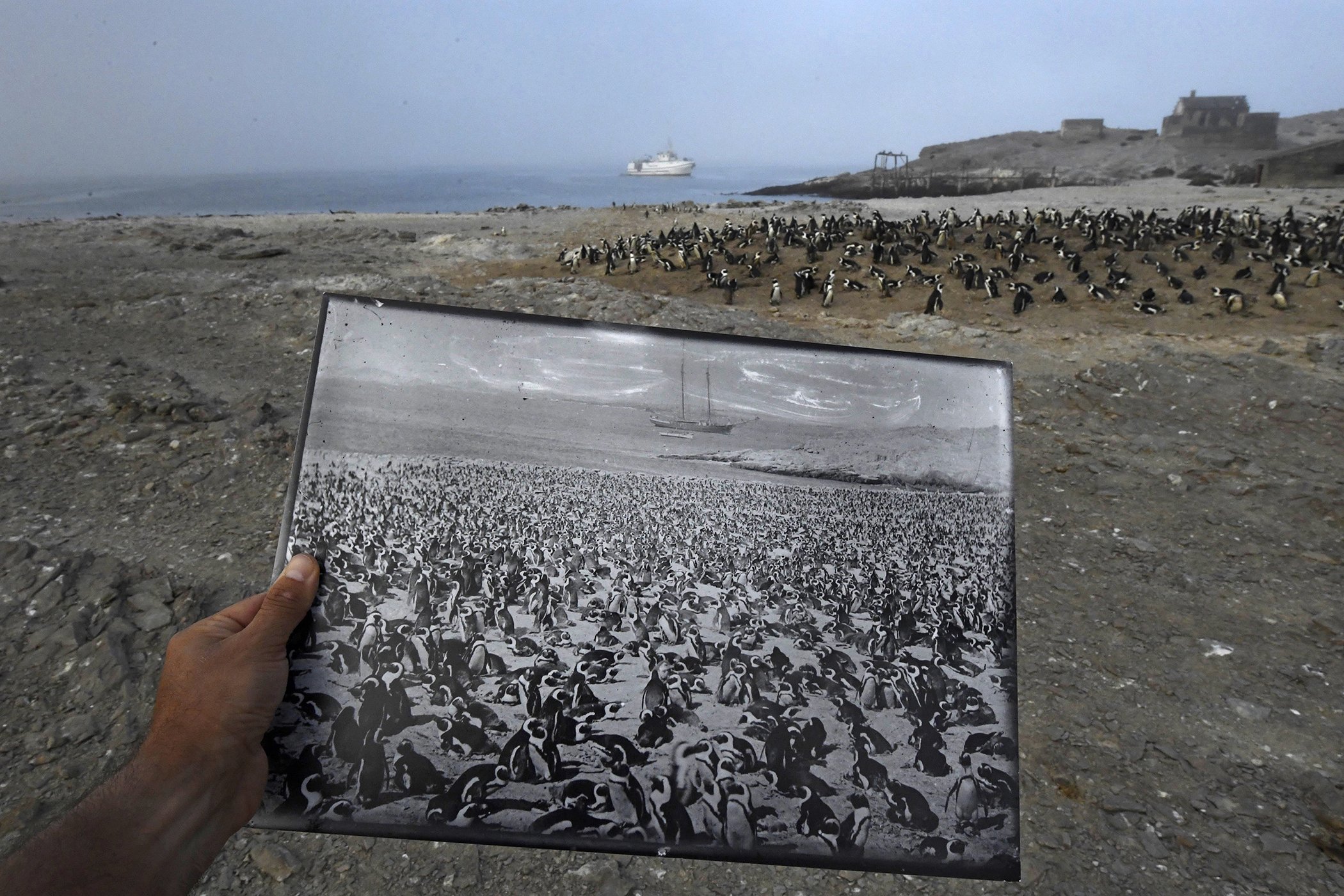 Back in Time: A photograph of a penguin colony from the late 1890s, in contrast to the declining numbers in 2017 at the same location, Halifax Island, Namibia. The colony once numbered over 100K penguins. Nominated in the Environmental Singles category.