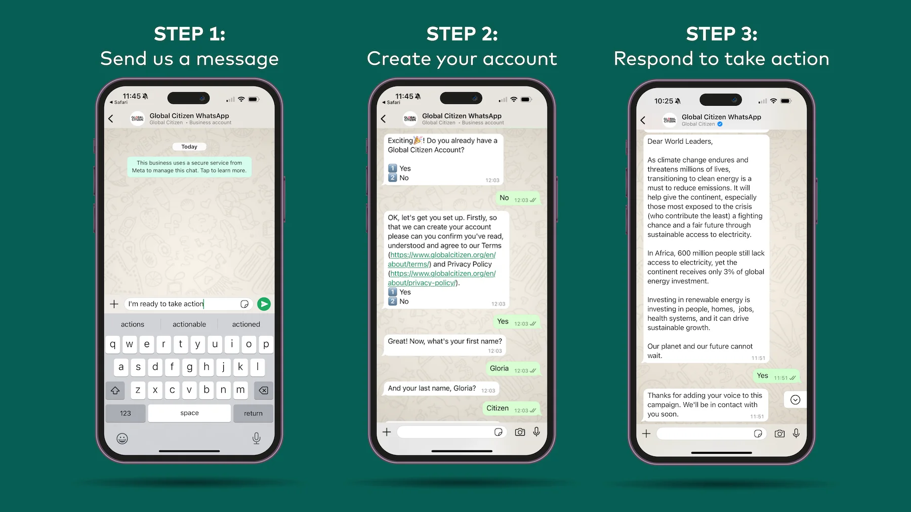 Want to make a difference in the world? Now, taking action is as easy as sending a message. With Global Citizen’s WhatsApp bot, you’ll receive weekly updates on the most pressing global issues and quick, impactful actions you can take—all from your messages.