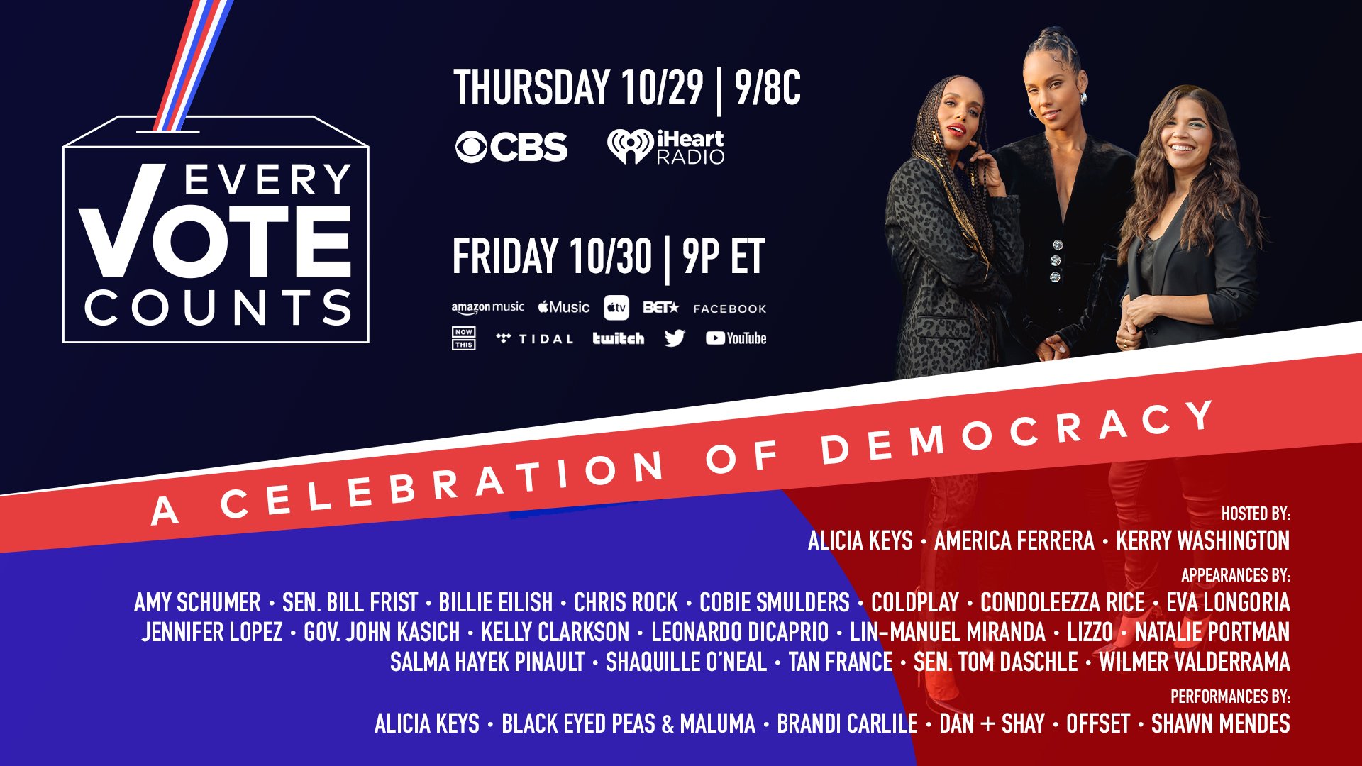 (New York, New York | Friday, October 30, 2020) Last night, Every Vote Counts: A Celebration of Democracy, a nationally televised event, aired on the CBS Television Network and streamed via CBS All Access, as well as iHeartMedia radio stations and app. The special will also be available to watch tonight, Friday, October 30th, at 9PM ET on Amazon Music, Apple Music, Apple TV App, NowThis, YouTube, Twitter, TIDAL and Facebook.