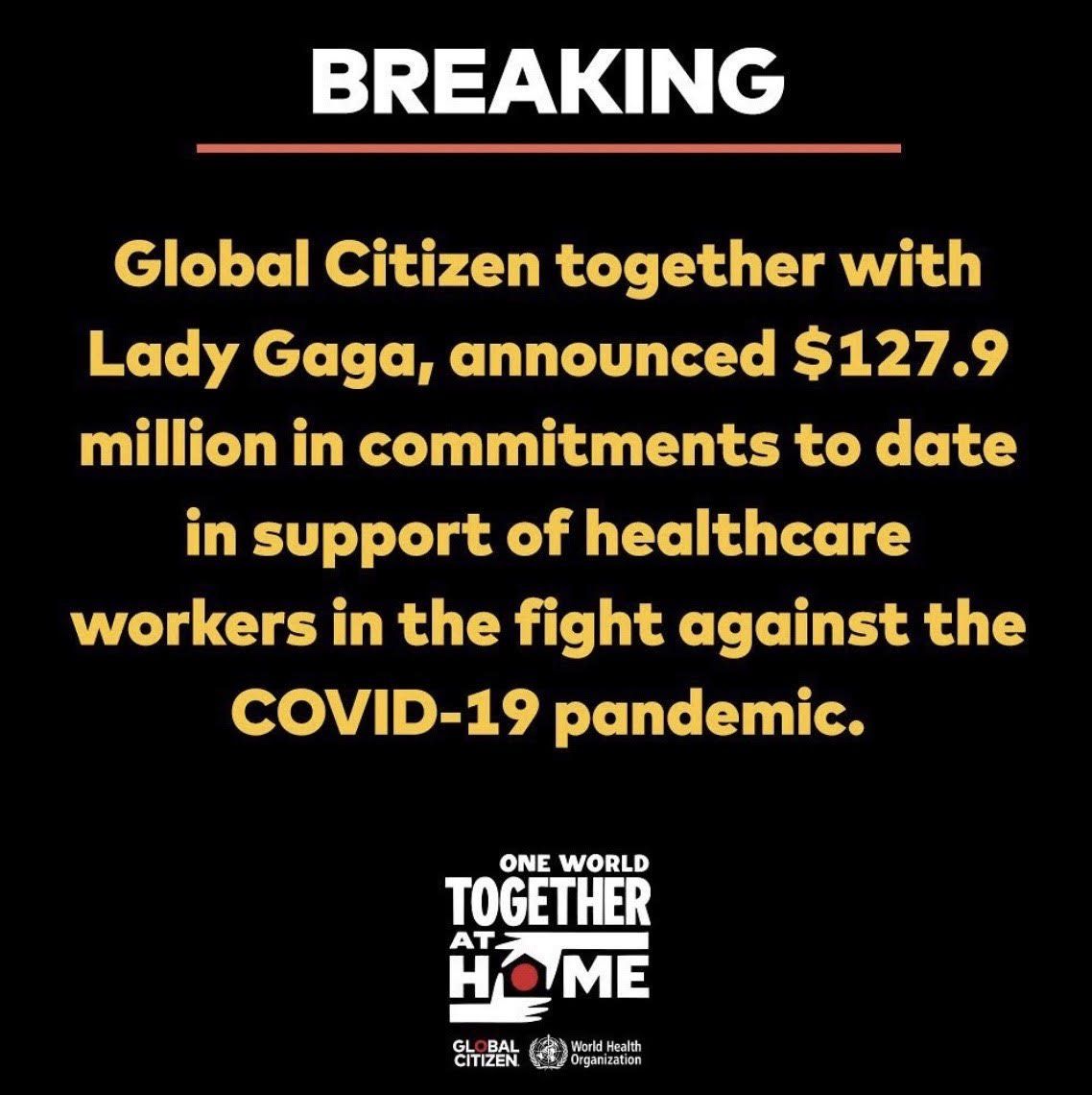 NEW YORK -- International advocacy organization Global Citizen, together with Lady Gaga, tonight announced $127 million in commitments to date in support of healthcare workers in the fight against the COVID-19 pandemic. Corporate partners and philanthropists announced their support for the COVID-19 Solidarity Response Fund for the World Health Organization, powered by the UN Foundation, during the One World: Together At Home global broadcast event. Donations to the fund will support WHO's work around the world, the vaccine development alliance Coalition for Epidemic Preparedness Innovations (CEPI) and UNICEF. The Together At Home effort will also aid over 100 additional local and regional charities that will also receive funds, including Education Cannot Wait, Direct Relief, Feeding America and United Way, among others. Changemakers, investors and foundation leaders actualized their giving to contribute quickly to related efforts, like stronger health systems and vaccine development.