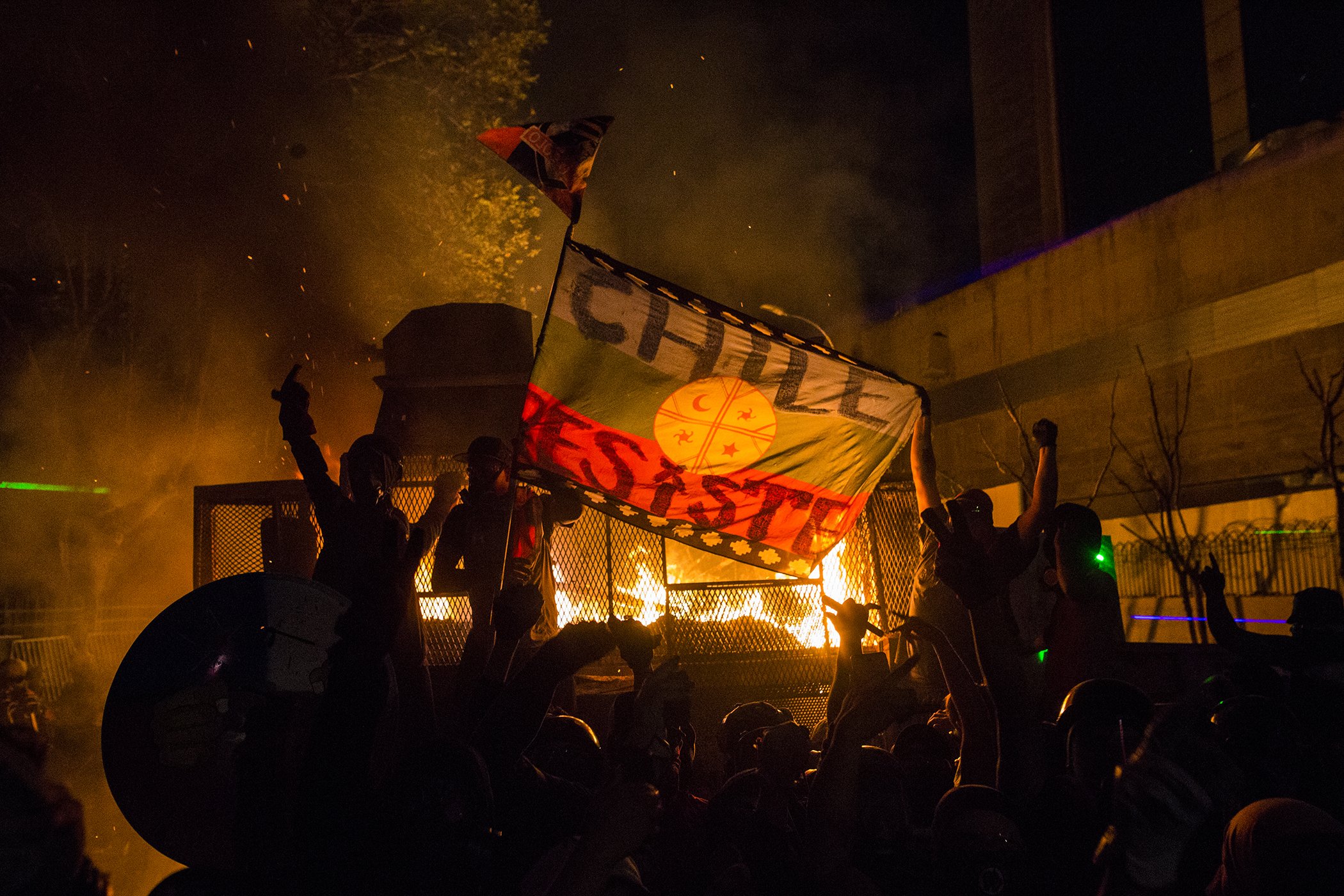 Protesters at night on the front of a truck hold a Mapuche indigenous flag that says "Chile Resiste." Calle Carabineros de Chile, Santiago, Chile, March 6, 2020.