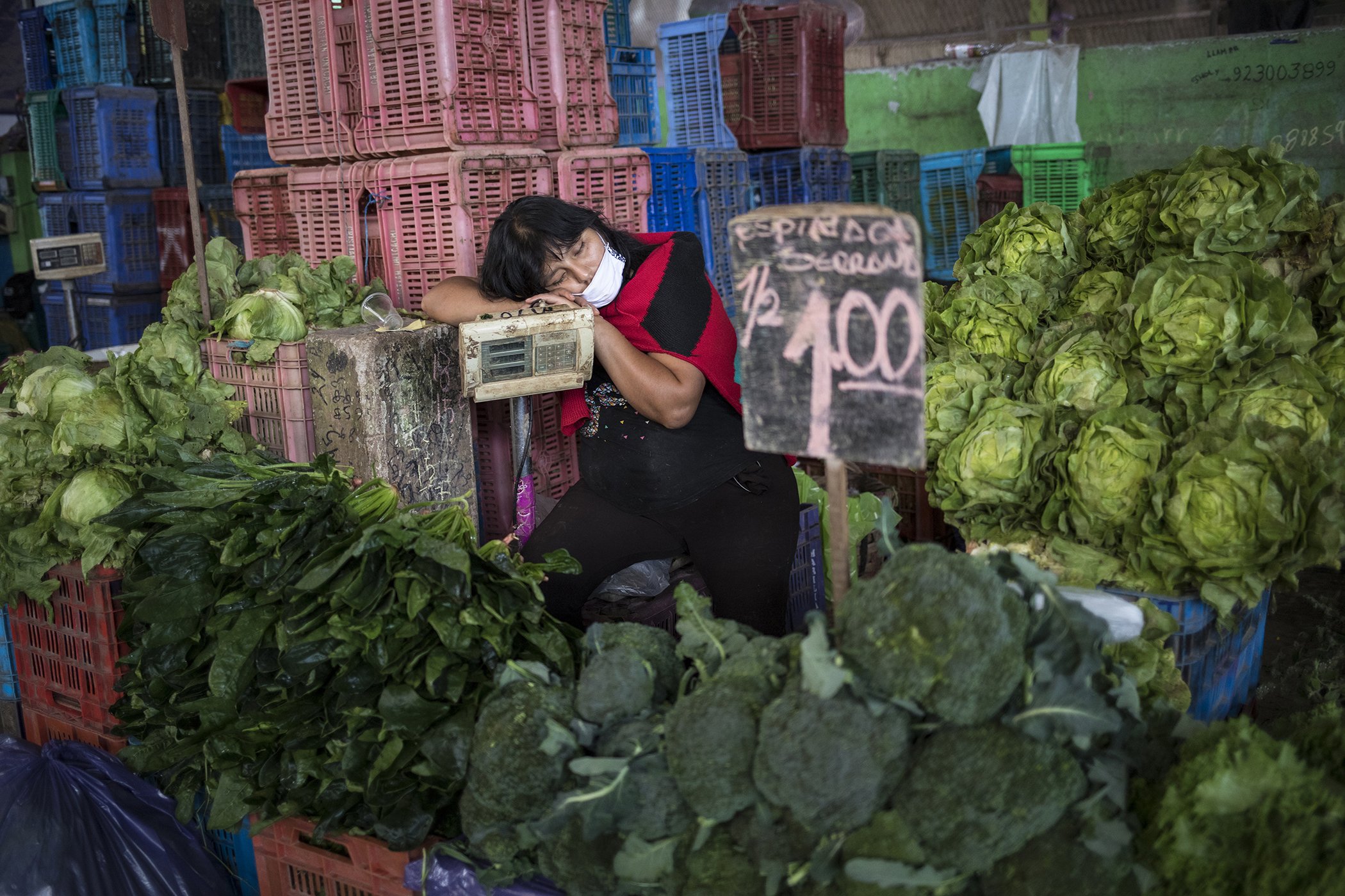 Wearing a face mask to prevent the contagious of the COVID-19, Kathy Velazquez, 30, takes a nap after working all night in her vegetables stand in Lima, Peru, April 11, 2020.