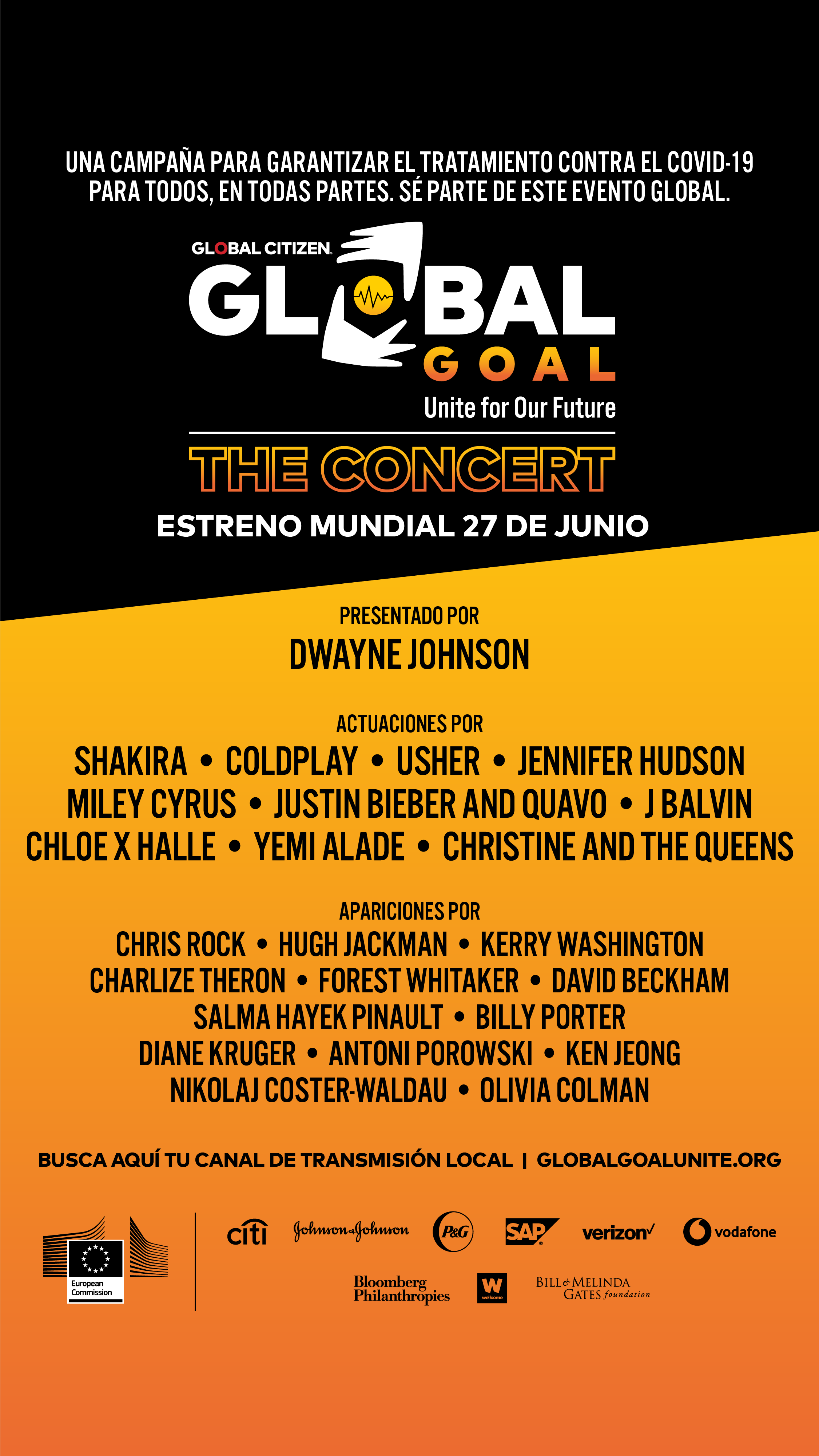 Global Goal: Unite for Our Future — El Concierto llegará por la noche y será televisado y transmitido online en todo el mundo. Presentado por Dwayne Johnson, El Concierto contará con las actuaciones de Chloe x Halle, Christine and the Queens, Coldplay, J Balvin, Jennifer Hudson, Justin Bieber y Quavo, Miley Cyrus, Shakira, Usher y Yemi Alade.