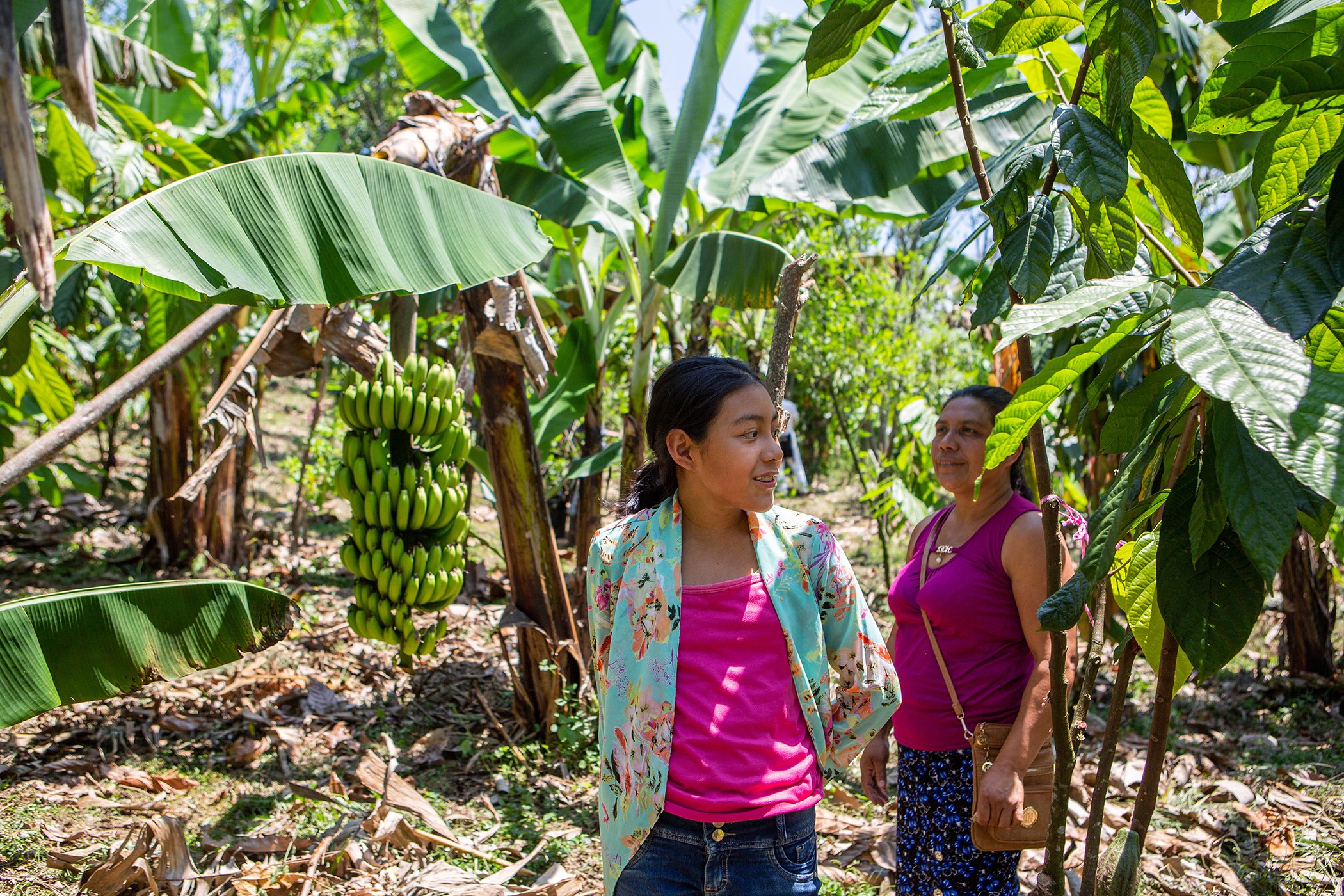 “Vengo al campo a ayudar y como mujer me motiva, ayudo a mi familia y diversificamos el suelo para fortalecerlo y hacer que sea más fértil”, explica, señalando los platanales, el maíz, el tomate, el chili y los camotes que han sembrado entre el cacao.