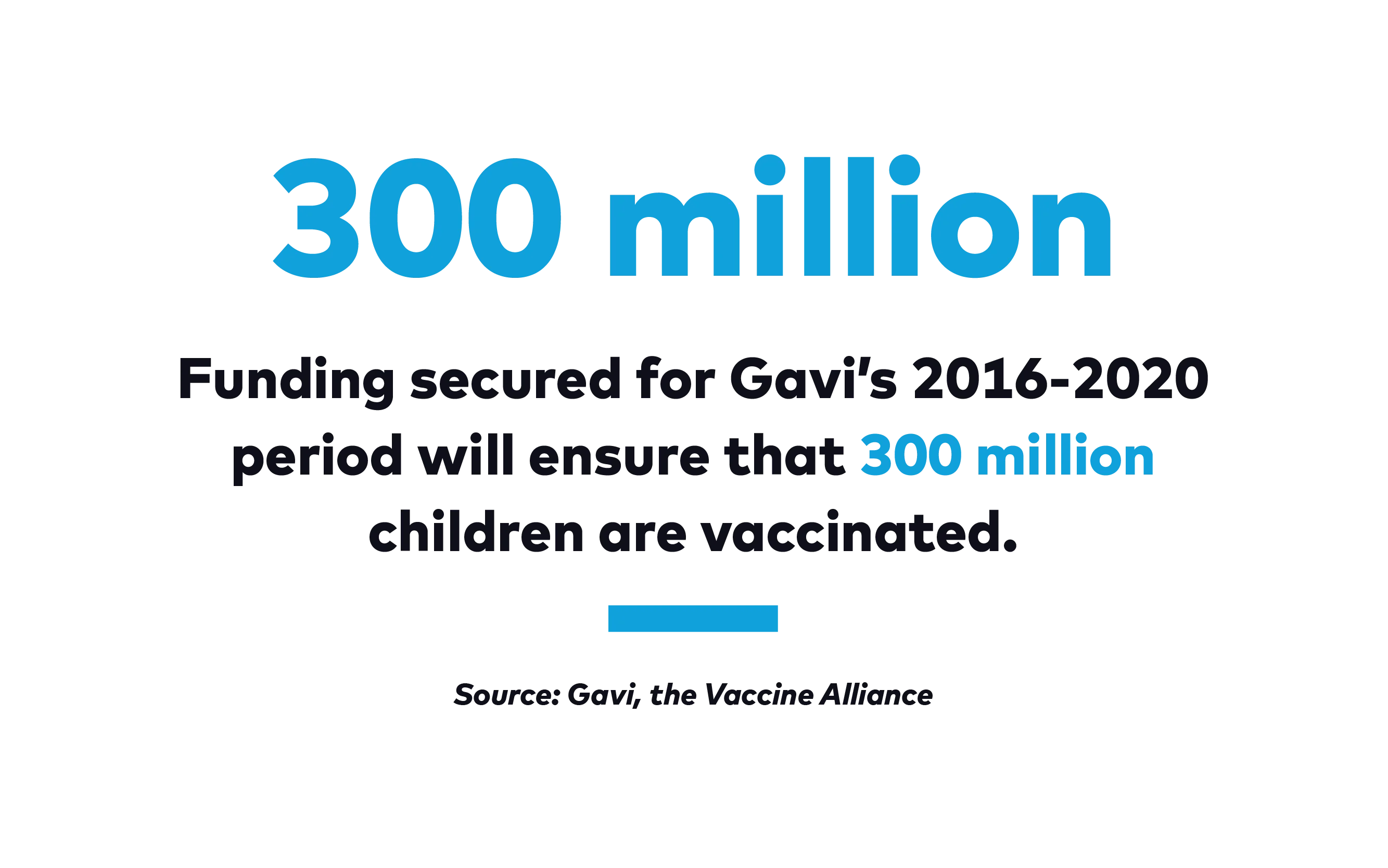 El financiamiento de Gavi para 2016 a 2020 asegurará que se inmunicen en total a 300 millones de niños, 127 millones ya habían sido vacunados al final de 2018. Se estima que estas vacunas podrían salvar hasta 6 millones de vidas, según Gavi.