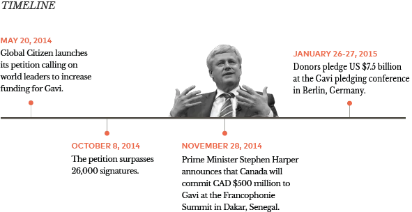 En la Cumbre de la Francofonía, el 28 de noviembre de 2014, el primer ministro Harper anunció que Canadá iba a comprometer 500 millones de dólares canadienses a Gavi.