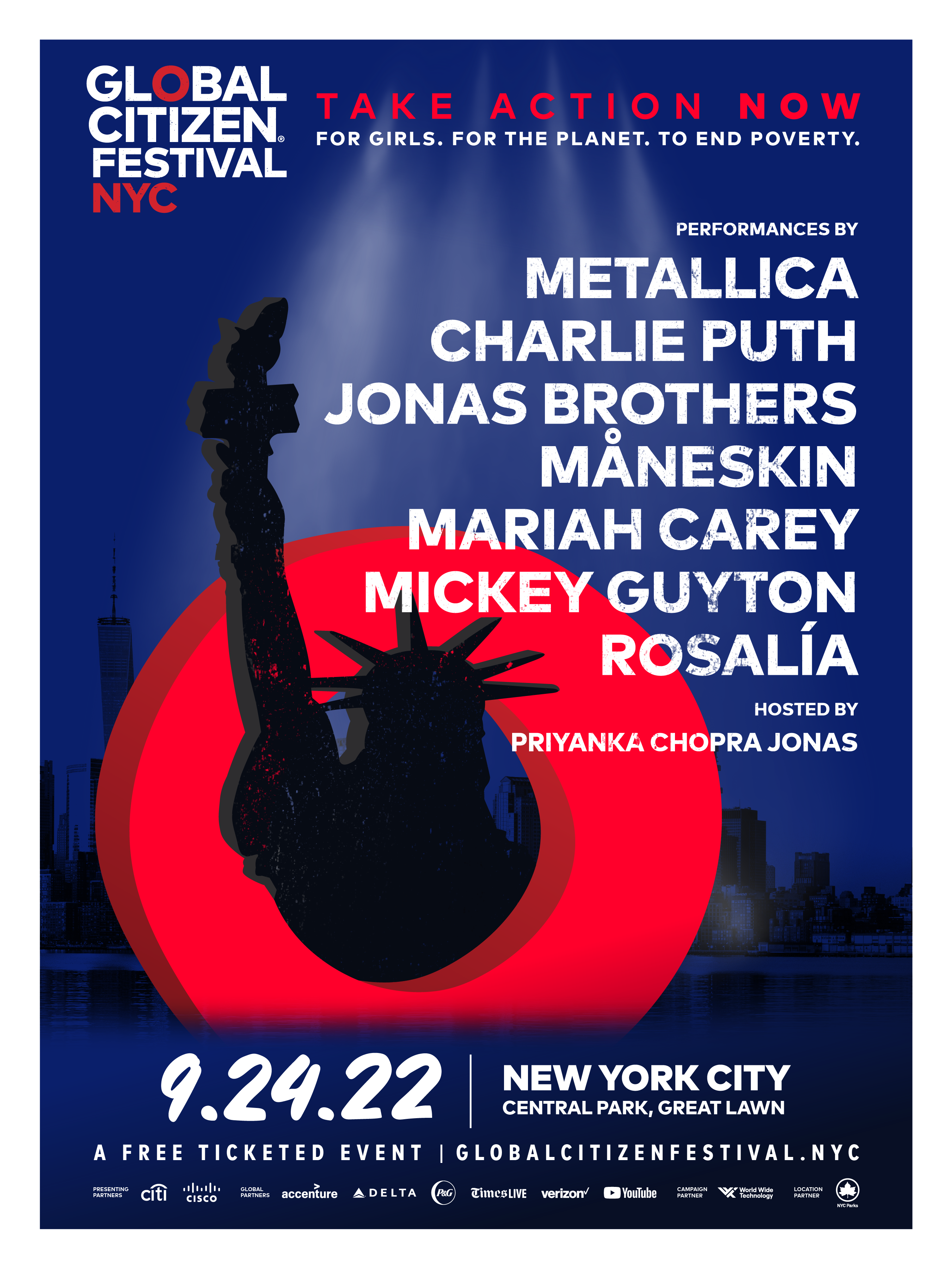 El lineup del Global Citizen Festival: NYC de este año incluye a Metallica, Charlie Puth, Jonas Brothers, MÅNESKIN, Mariah Carey, Mickey Guyton y Rosalía. La actriz, productora, autora y embajadora de Global Citizen, Priyanka Chopra Jonas, será la anfitriona del evento. Para el Global Citizen Festival: Accra, puedes encontrar más información sobre el lineup aquí.