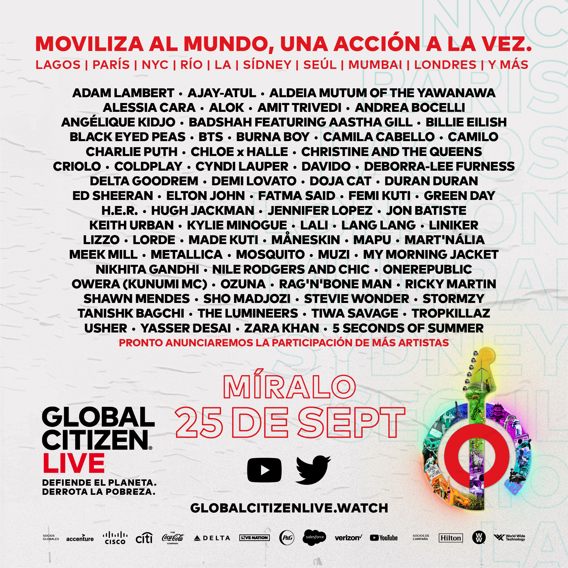 Global Citizen está agradecido con el apoyo de organizaciones increíbles que abogan por un impacto, y que incluyen: 1t.org, American Forests, The Asia Society, Ban Ki Moon Center, Climate Neutral, Coalition for Epidemic Preparedness Innovation, Conservation International, COVID-19 Therapeutics Accelerator, Education Cannot Wait, GAVI, the Vaccine Alliance, Global Solidarity Fund, Green Climate Fund, Global Polio Eradication Initiative, Global Financing Facility for Women, Children and Adolescents, International Fund for Agricultural Development, International Rescue Committee, LISC, Namati, Nigeria Solidarity Support Fund (NSSF), One Acre Fund, Outright Action International, Paris Peace Forum, The Pathfinders, Re:Wild, Rotary International, Seadream Family Foundation, Sheth Sangreal Foundation, Shining Hope for Communities (SHOFCO), Slum2School Africa, South African Education Project, The Foundation for Innovative New Diagnostics, The Global Fund (to Fight TB, AIDS, Malaria), UNICEF, UNICEF Australia, UNITAID, UNFPA, Women at Risk International Foundation (WARIF), World Food Programme, World Health Organization, World Health Organization Foundation.