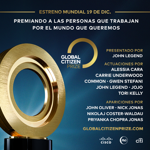 La ceremonia completa seré televisada: la premier del Global Citizen Prize se realizará el 19 de diciembre a las 8 p.m., hora del este en NBC en Estados Unidos y CTV en Canadá. También será transmitida en Albavisión, Digicel, Insight TV, Mediacorp, SABC, Sky Media, TRACE Anglophone West Africa, Viacom y Vodafone en África, Asia, Canadá, Centroamérica, India, Europa y el Reino Unido.