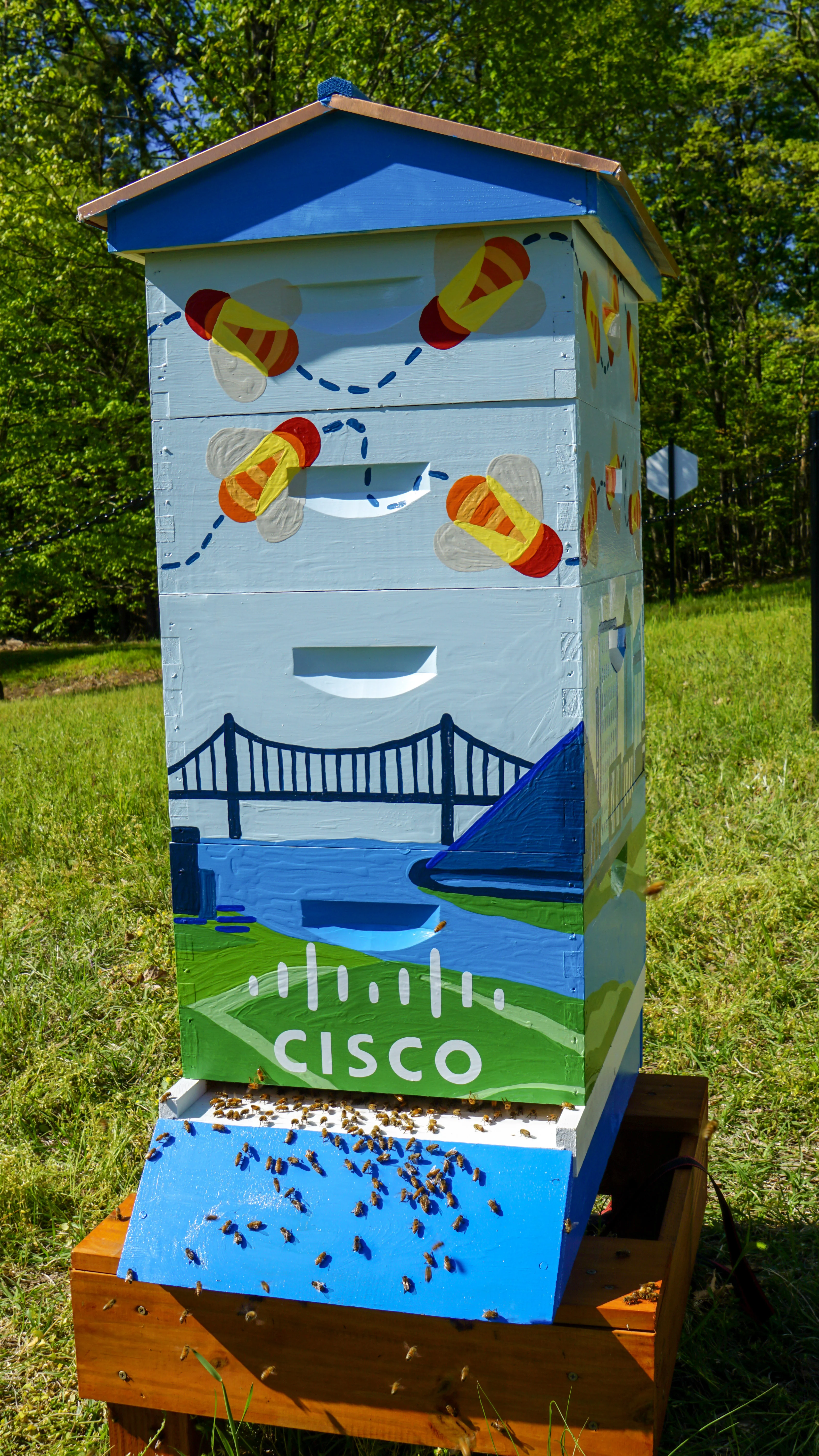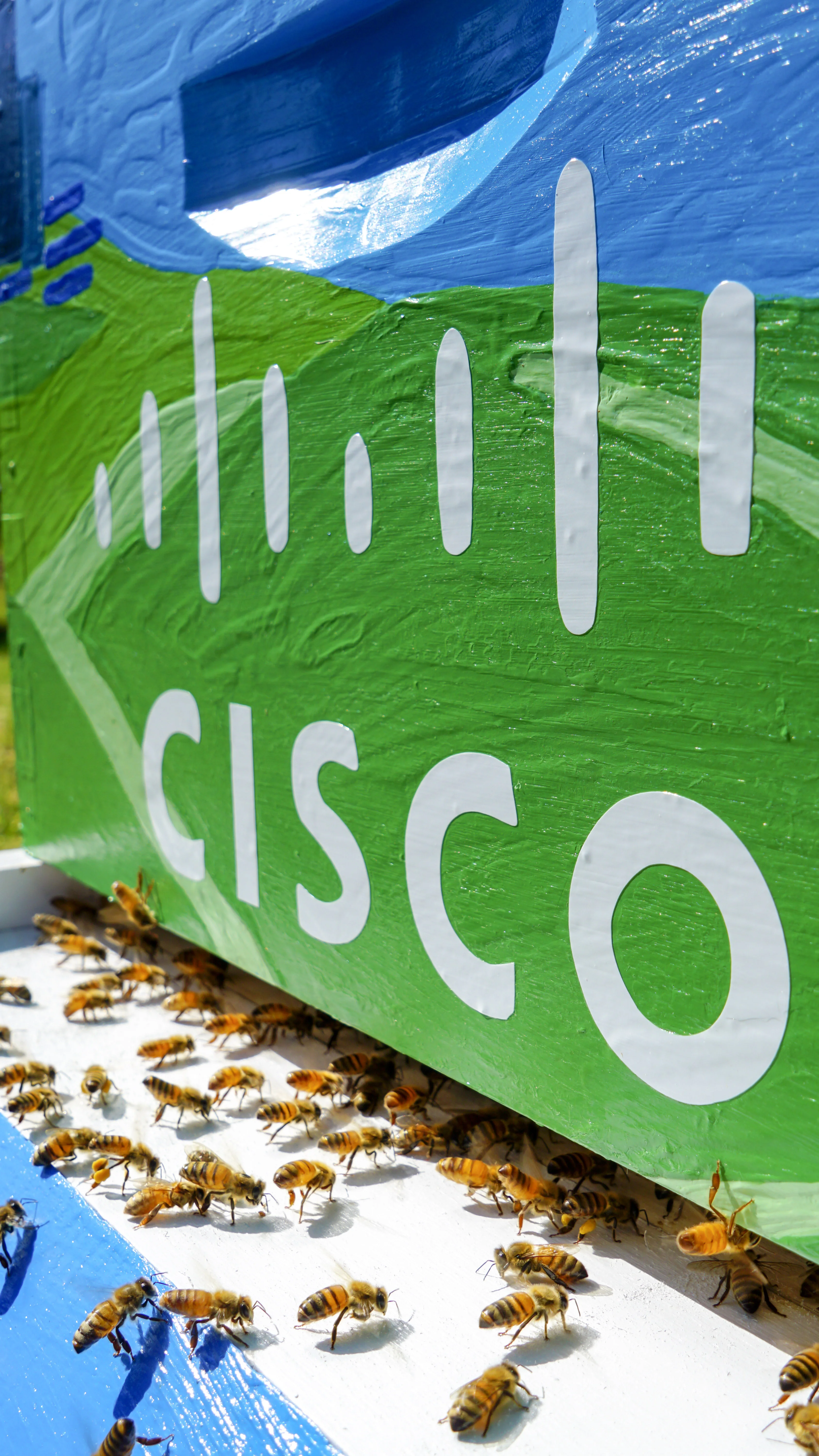 En colaboración con Bee Downtown y la Fundación RTP, Cisco instaló tres colmenas pintadas a mano cerca de su campus en Carolina del Norte, que ahora son el hogar de más de 100.000 abejas. La esperanza es que, introduciendo más abejas en el medio ambiente y utilizando prácticas de apicultura responsables, las poblaciones de abejas recuperen su número previo y apoyen los sistemas alimentarios y la biodiversidad.