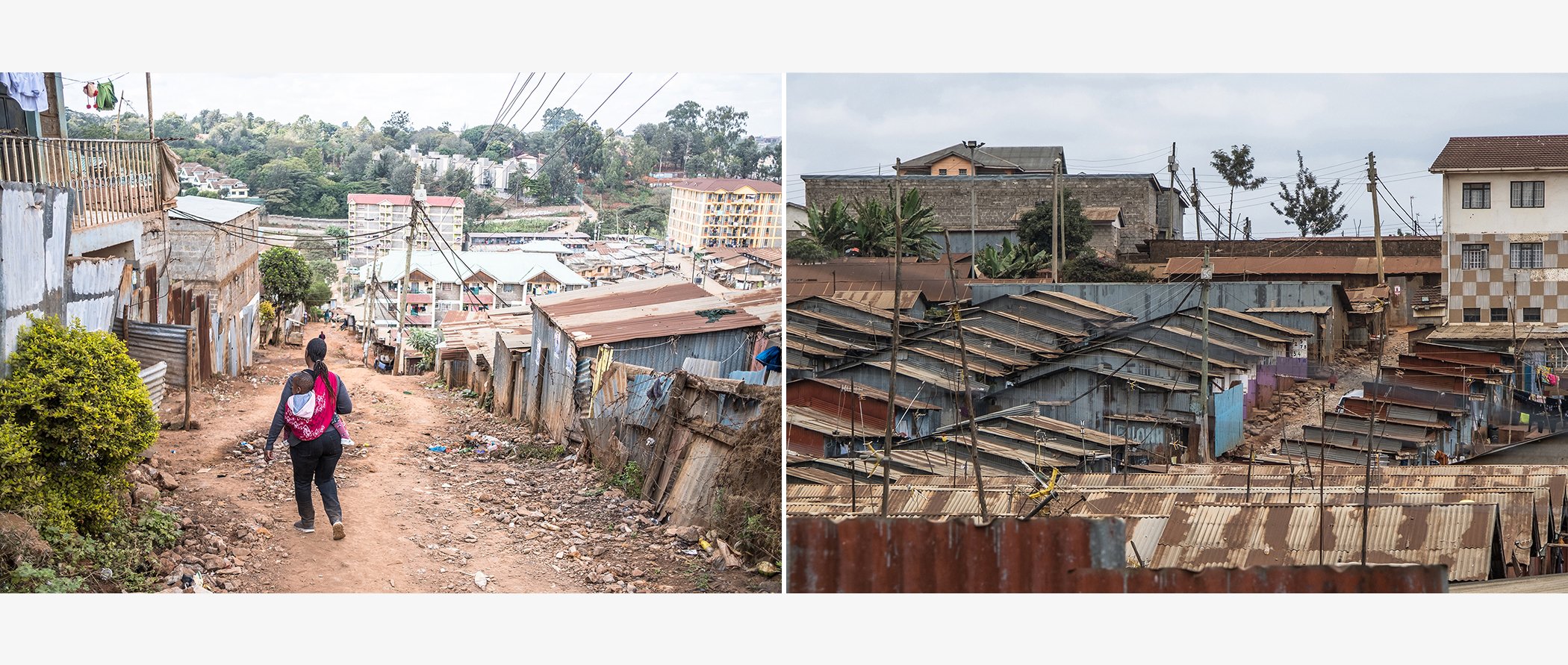 (L) Juliet Mgambi Mwandango and her daughter Lenora in Kangemi, Nairobi, Kenya. (R) A view of houses in Kangemi.