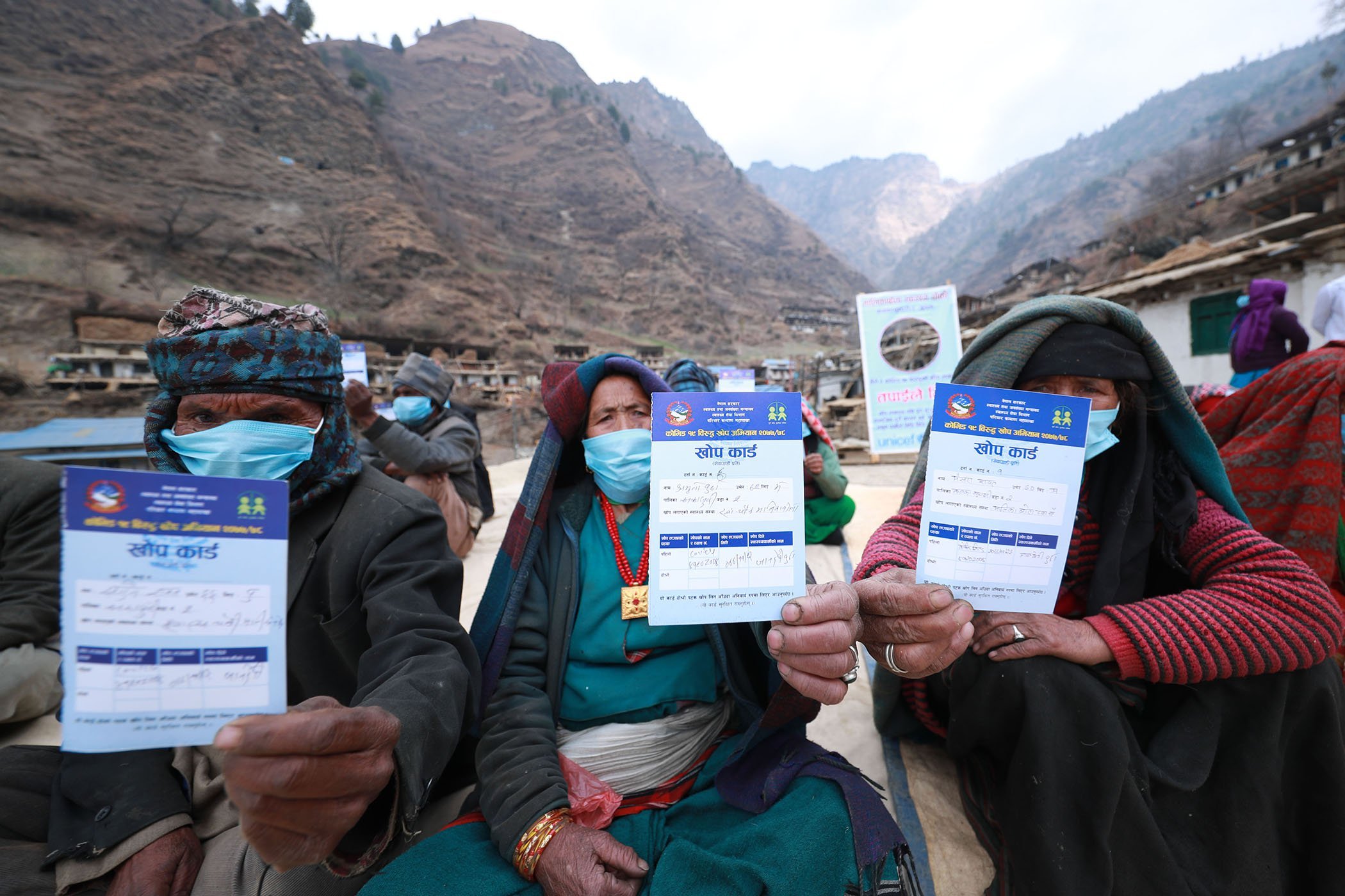 An elderly local resident of the remote Kankasundari area in Jumla District in Nepal, receives the COVID-19 vaccine at the hands of nurse Jandevi Budha at the Malikabota Health Post on March 7, 2021. The Government of Nepal has launched the second phase of the vaccination campaign targeting those who are most vulnerable to developing severe illness from COVID-19 including the elderly and people with comorbidities.