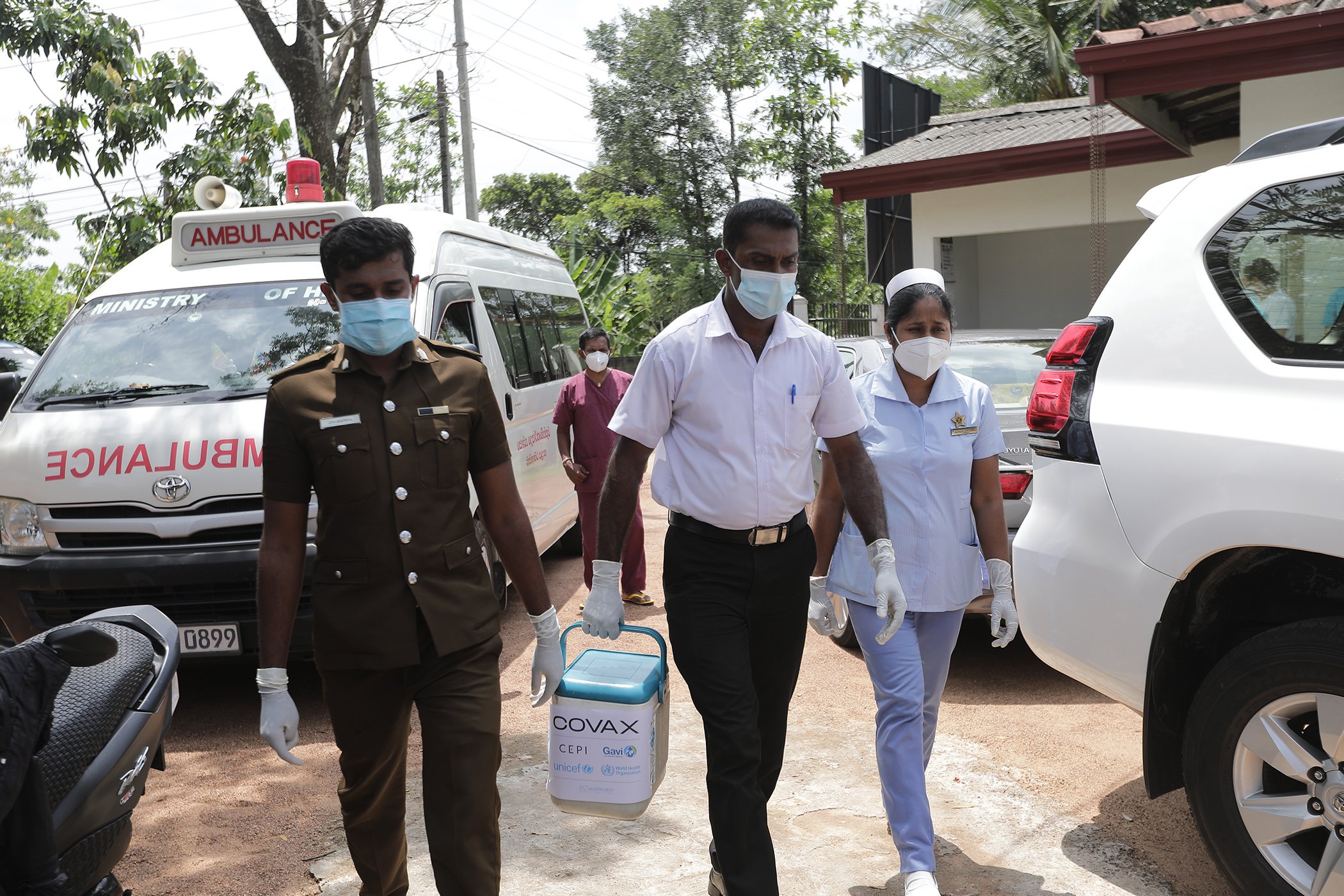 In Sri Lanka, officials maintain the cold chain for the AstraZeneca as they bring the vaccine to a clinic targeted for the 60+ population.