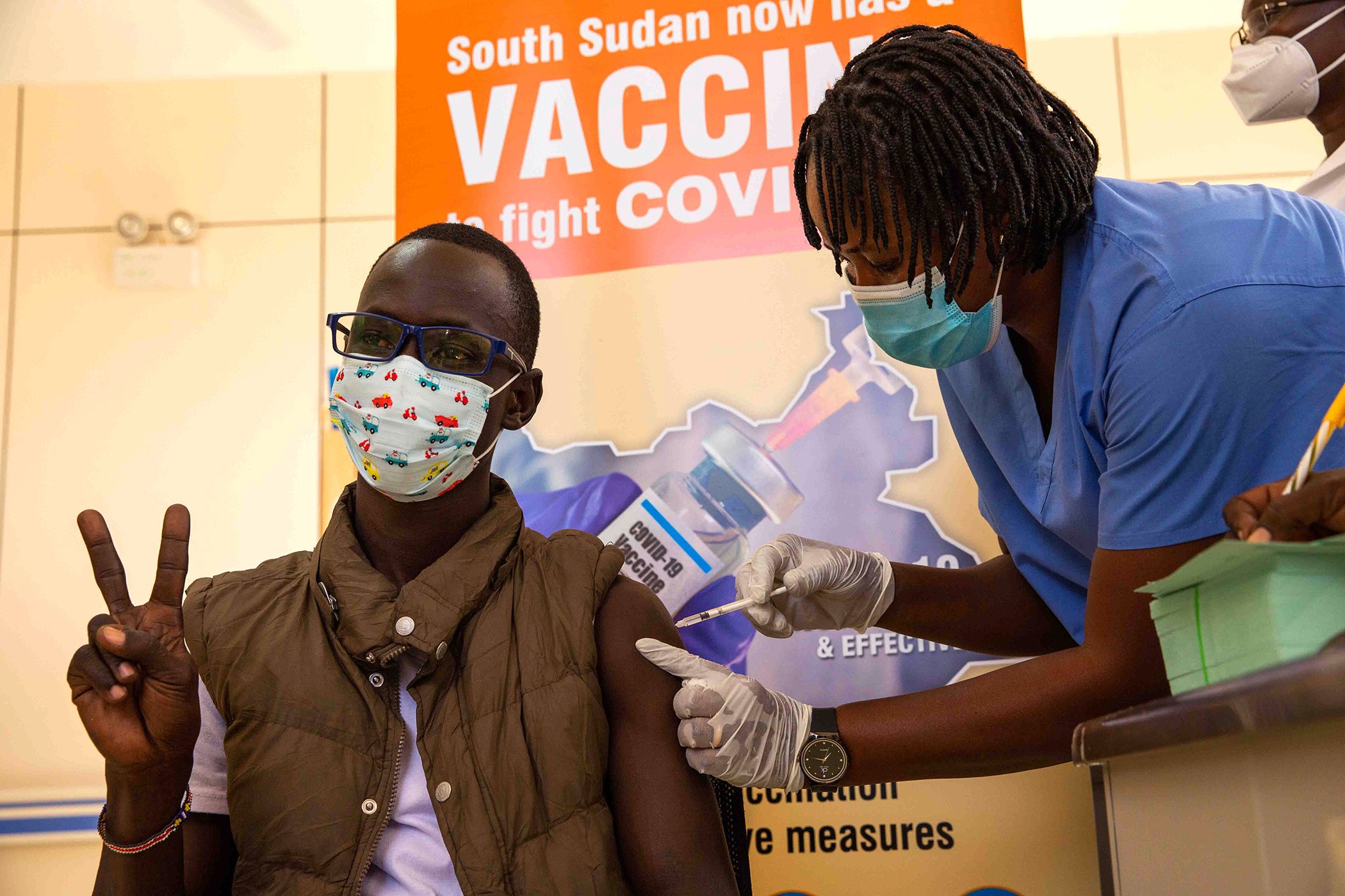 Health care worker Issac Lemi Beshir receives his COVID-19 jab during the launch of the vaccination drive at Juba Teaching Hospital. South Sudan received 132,000 doses of the AstraZeneca COVID-19 vaccine through the COVAX facility on March 25, 2021.